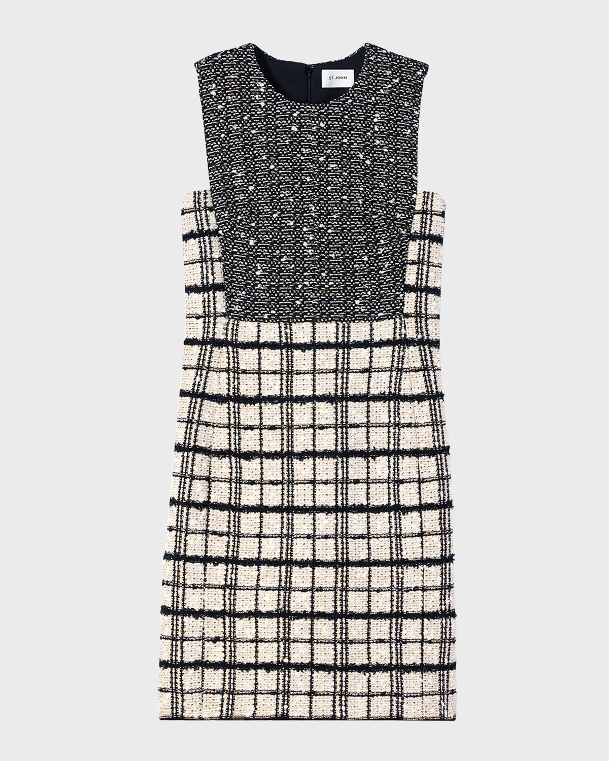 St. John bonded multi slub plaid tweed dress featuring a contrast bib front and back Round neckline Sleeveless Sheath silhouette Midthigh length Invisible back zip Acrylic/wool/cotton Lining: Polyester Dry clean Imported