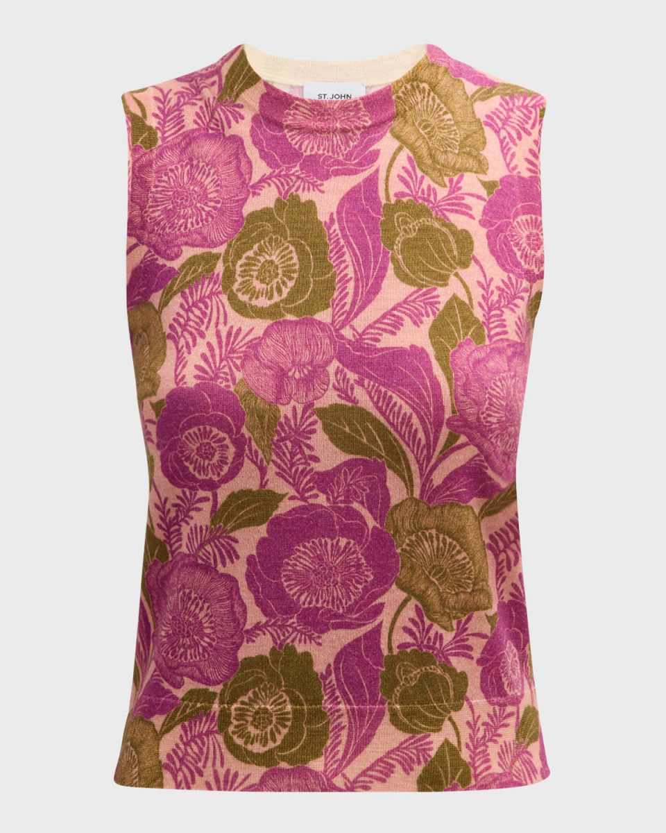 St. John fine gauge Merino knit sweater tank featuring allover California poppies print Crew neckline Sleeveless Fitted Ribbed hem Pullover style Wool Professional cleaning recommended Imported
