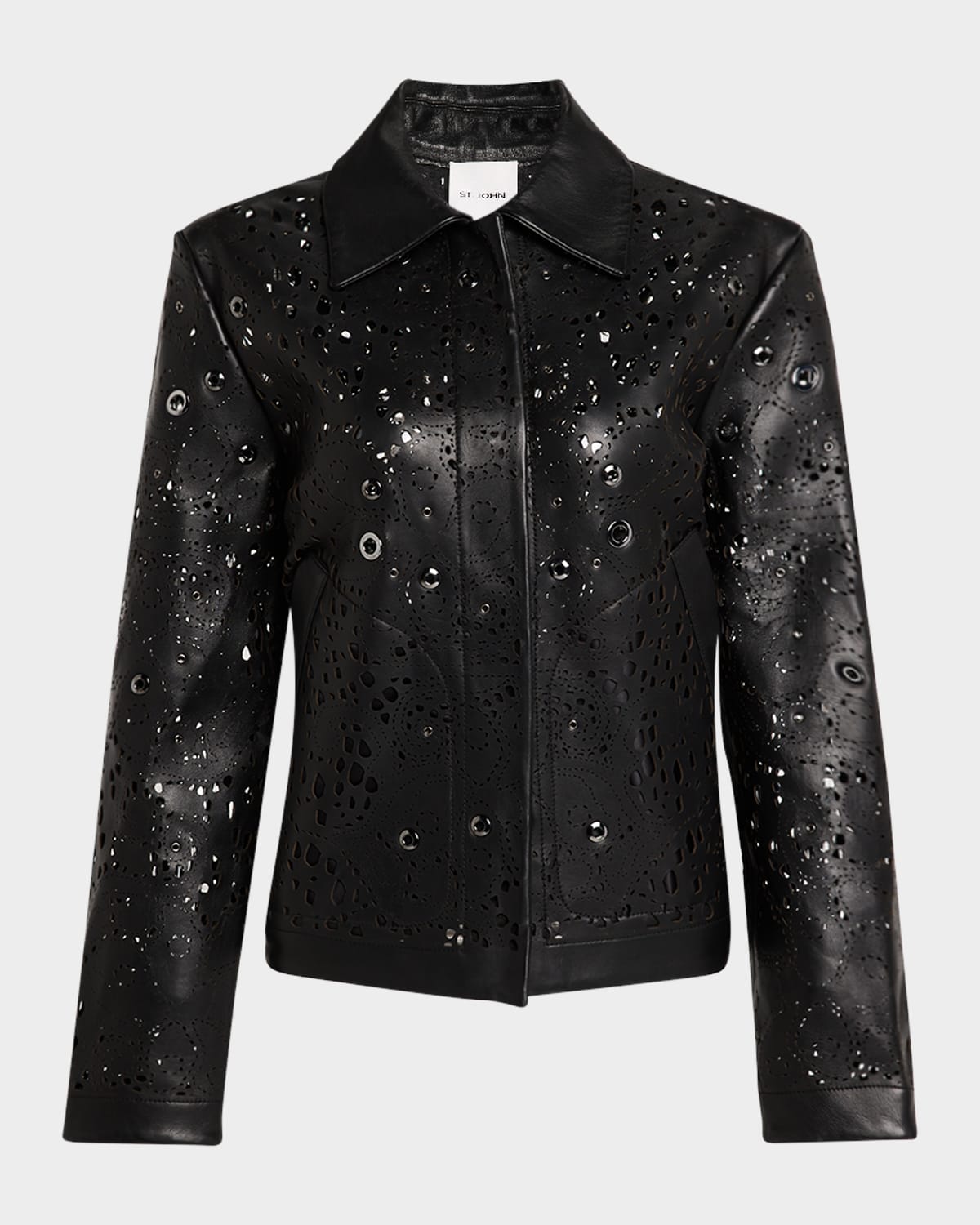 St. John lambskin leather jacket with lace cutouts and grommet embellishments Point collar; concealed button front Long sleeves Side welt pockets Straight fit Leather Dry clean Imported
