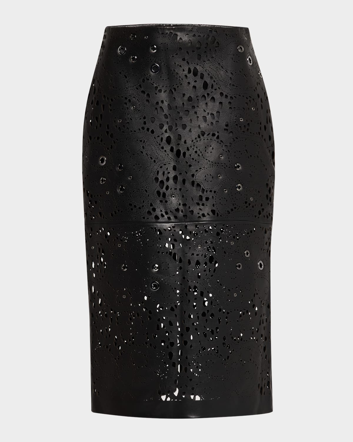 St. John lambskin leather skirt featuring lace laser cutouts and grommet embellishment Mid waist Hem falls below the knee Skirt falls straight from hip to hem Centerback vented hem Hidden closure Leather Dry clean Imported