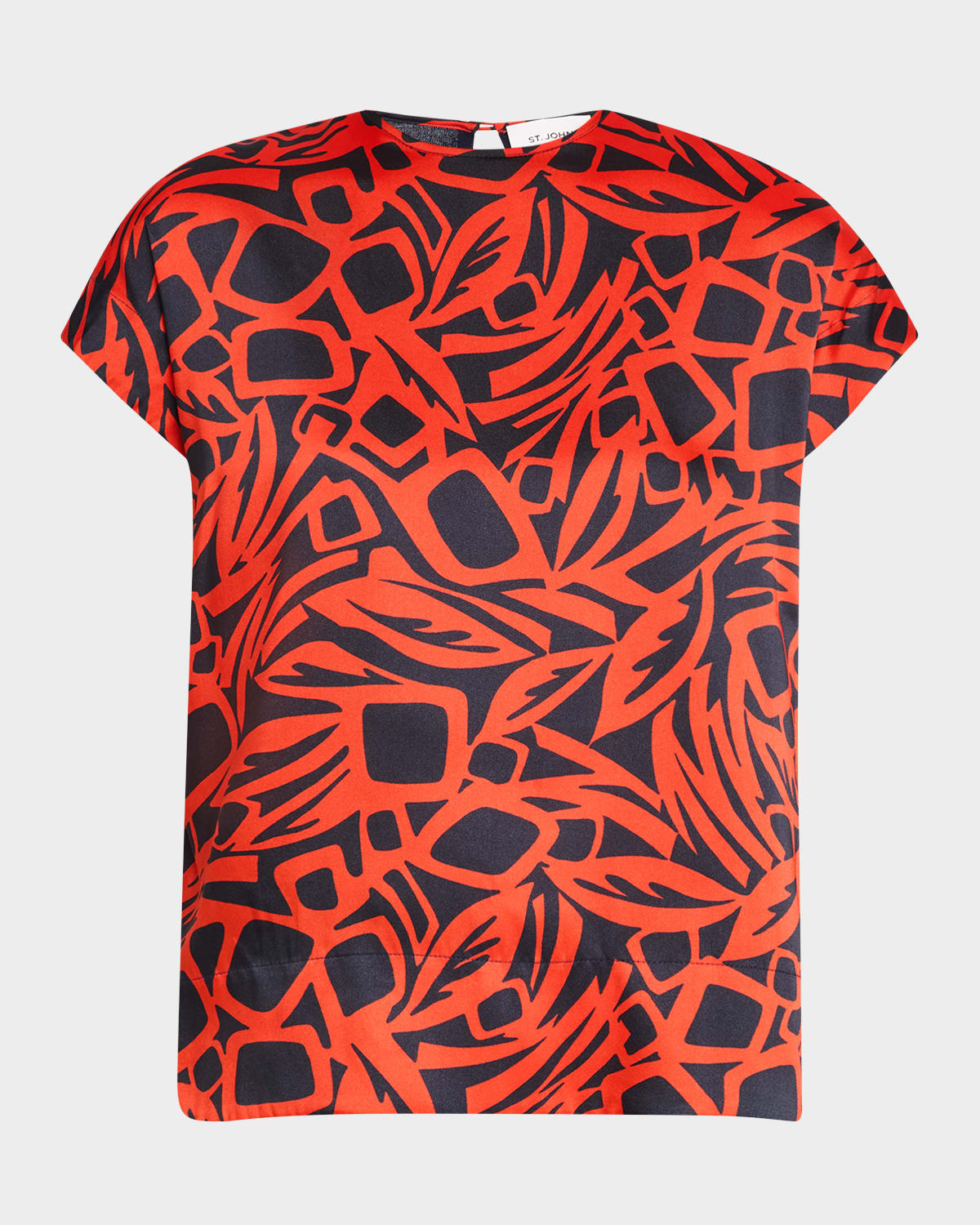 St. John top in a knit and vintage botanical printed twill combo Crew neckline; button/keyhole back Short sleeves Relaxed fit Polyester/wool Dry clean Imported