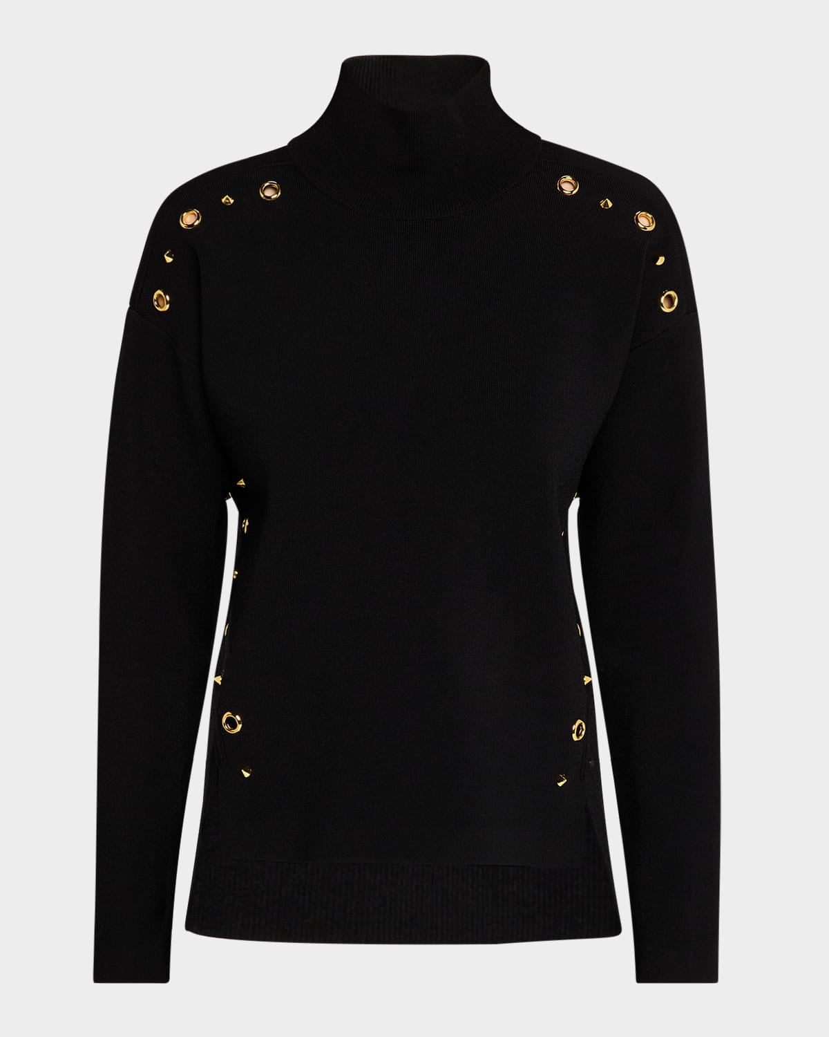 St. John interlock knit sweater featuring eyelet embellishments and side slits Mock neckline Long sleeves Relaxed fit Ribbed hem Pullover style Viscose/elastane Dry clean Imported