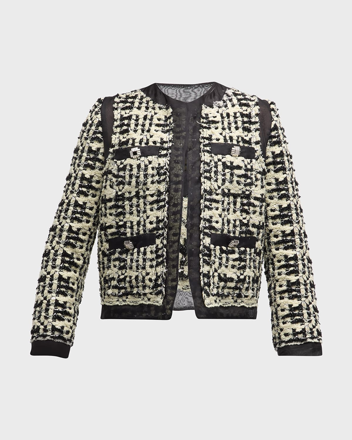 Organza-Trim Metallic Slub Paillette Plaid Knit Jacket