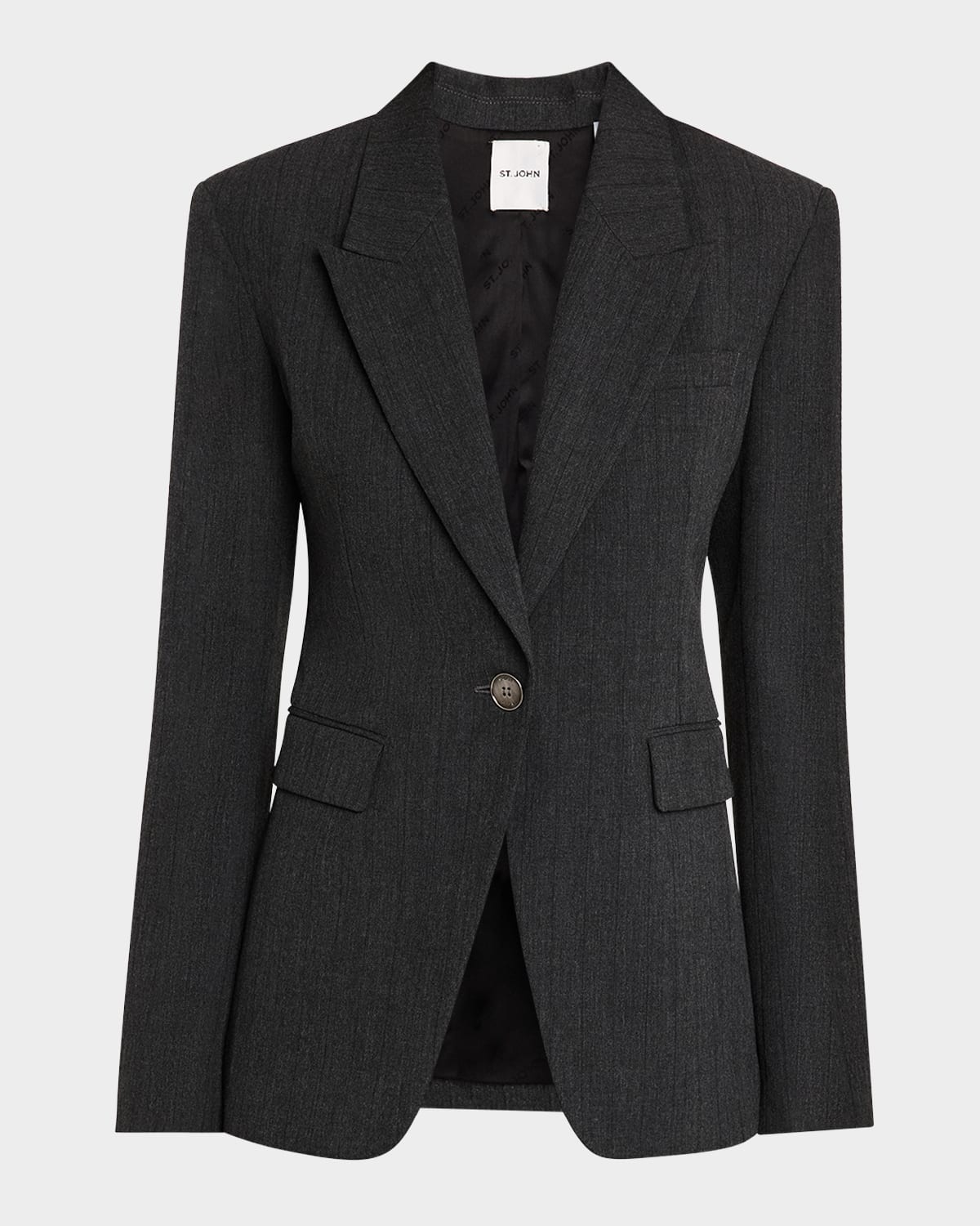 St. John luxe suiting jacket featuring a pinstripe motif Peak lapels; singlebreasted front Long sleeves; button cuffs Chest welt pocket; side flap pockets Tailored fit Centerback vented hem Polyester/viscose/elastane Dry clean Made in Portugal