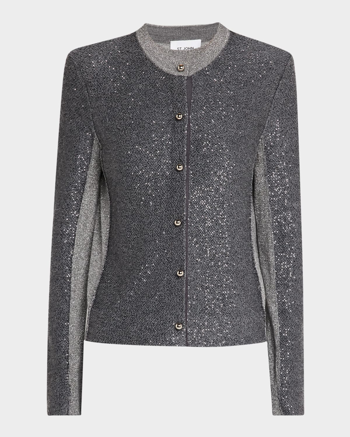 St. John metallic knit cardigan featuring a sequin knit front and decorative snap buttons Crew neckline; snap front Long sleeves Relaxed fit Polyester/viscose/wool Dry clean Imported