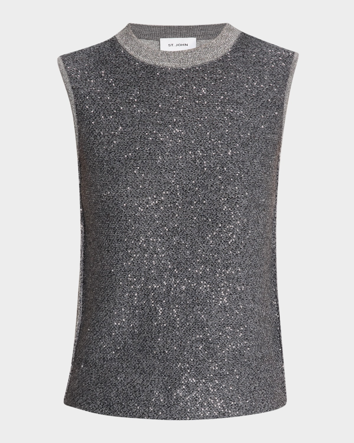 St. John metallic knit tank top featuring a sequin knit front Crew neckline Sleeveless Relaxed fit Ribbed hem Pullover style Polyester/viscose/wool Dry clean Imported