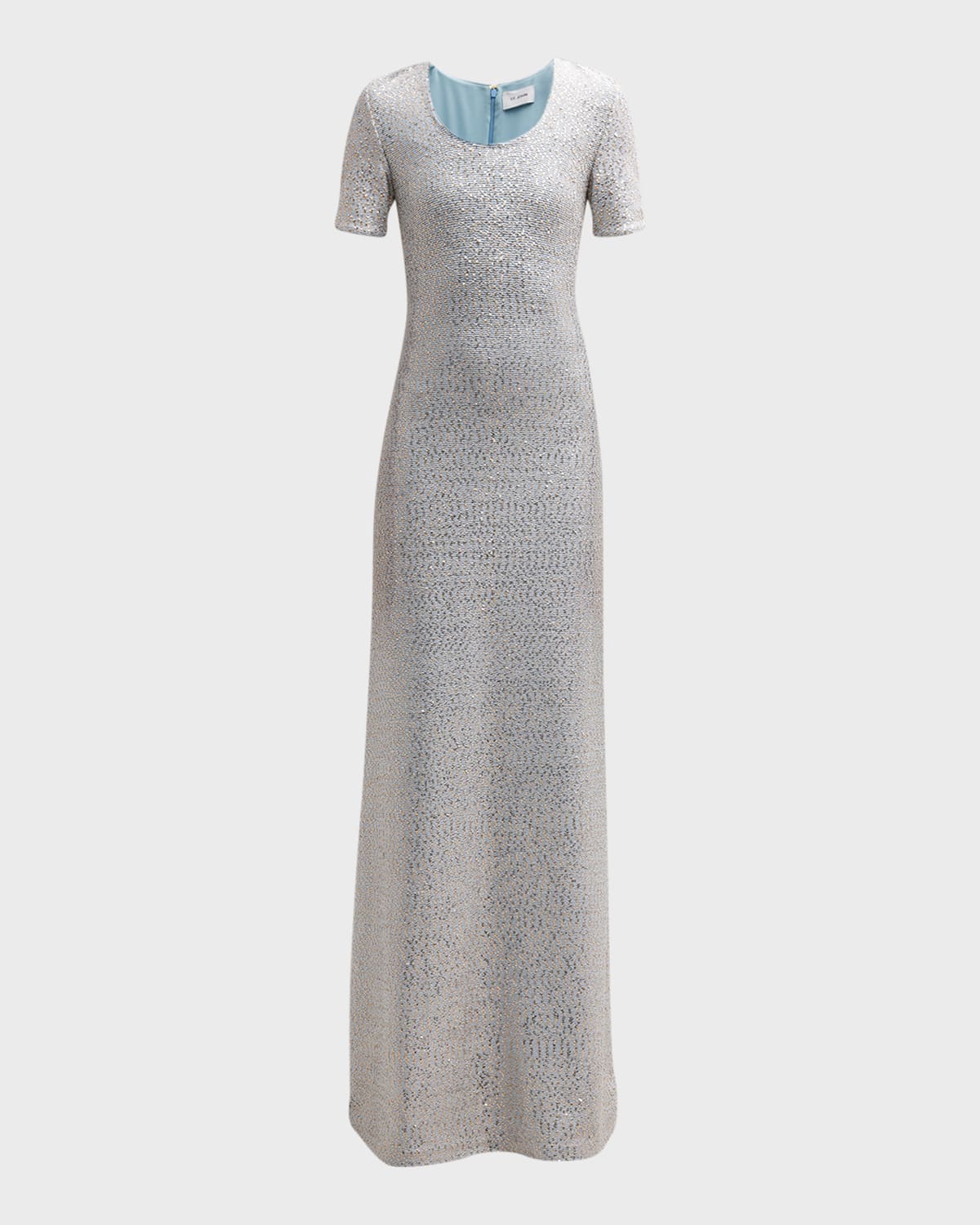 St. John gown in sequin knit Scoop neckline Short sleeves Aline silhouette Floor length Invisible back zip closure Rayon/polyester Lining: Polyester Dry clean Made in USA from imported materials