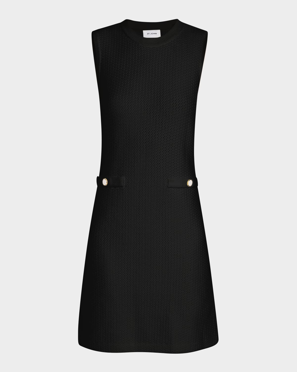 St. John dress in multiscale textured stretch knit with decorative snap side pockets Round neckline Sleeveless Sheath silhouette Knee length Invisible zip shoulder Viscose/nylon/polyamide/elastane Dry clean Imported