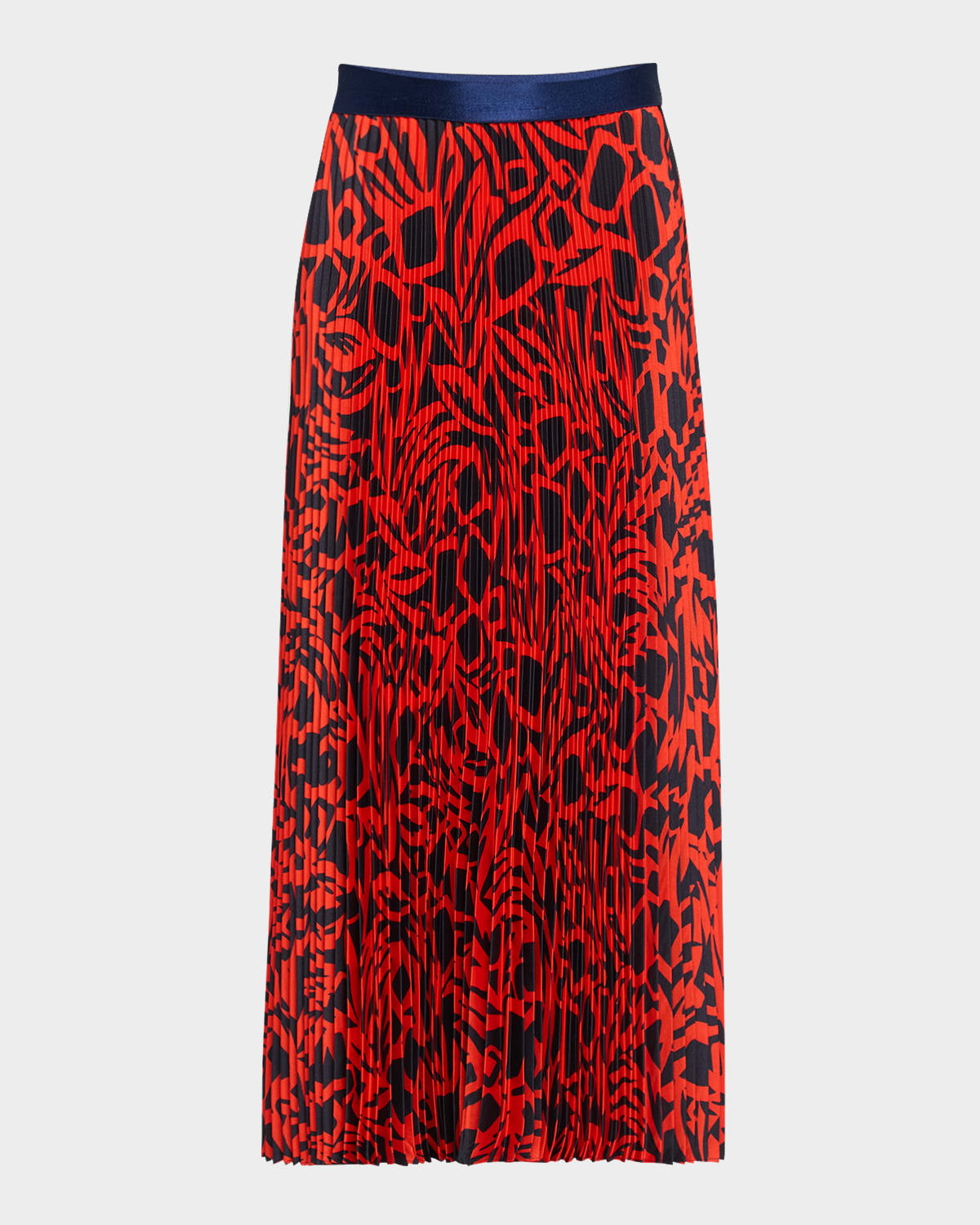 St. John skirt finished with pleating, vintage botanical print, and an elasticized waistband High waist Hem falls below the knee Aline silhouette Pullon style Polyester Dry clean Made in USA