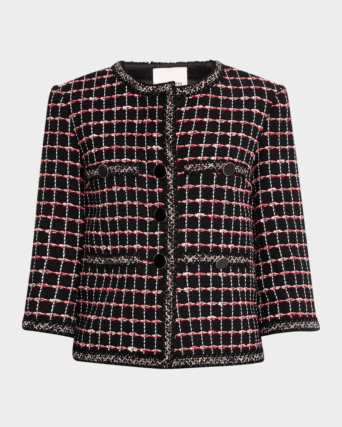 St. John window pane tweed with contrast trim Round neckline; button front 3/4 sleeves Front button welt pockets Regular fit Hip length Cotton/polyester Dry clean Imported