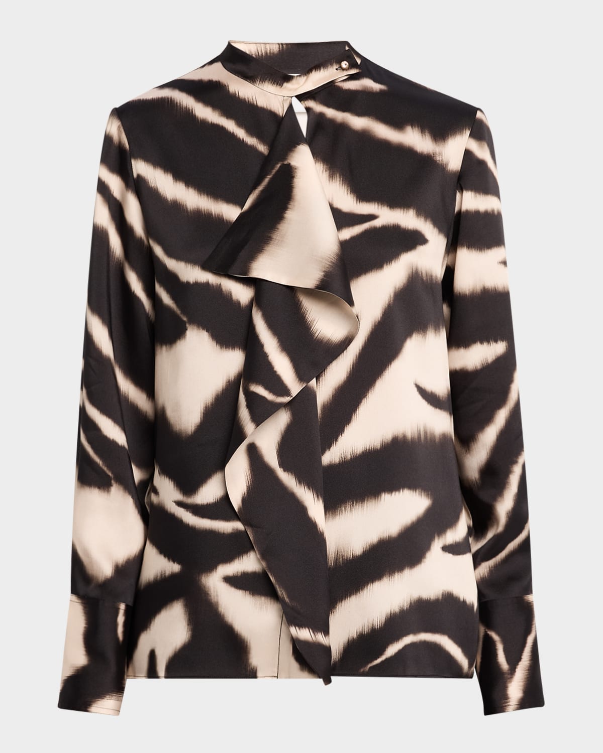 Zebra-Print Ruffle Long-Sleeve Blouse