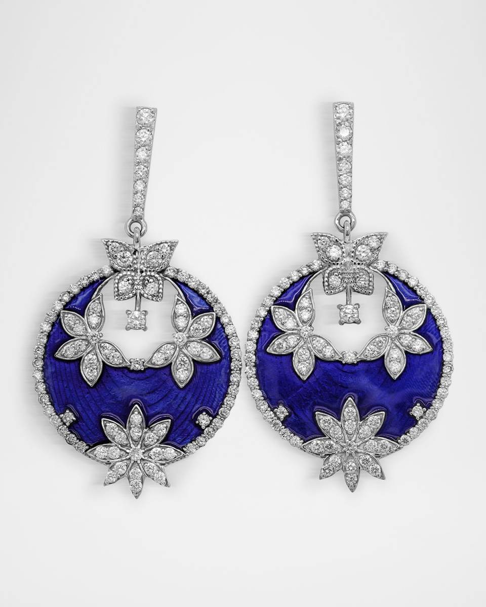 Stambolian blue enamel drop earrings are crafted with colorless G diamonds in a butterfly and flower setting Polished 18karat white gold 2.80 total diamond carat weight For pierced ears Made in USA