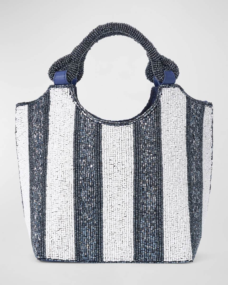STAUD "Cote" top handle bag in striped beaded glass Top handles, 4.7" drop Open top Interior, one zip pocket Lining: Rayon Approx. 7.3"H x 9.8"W x 6.3"D Spot clean Imported