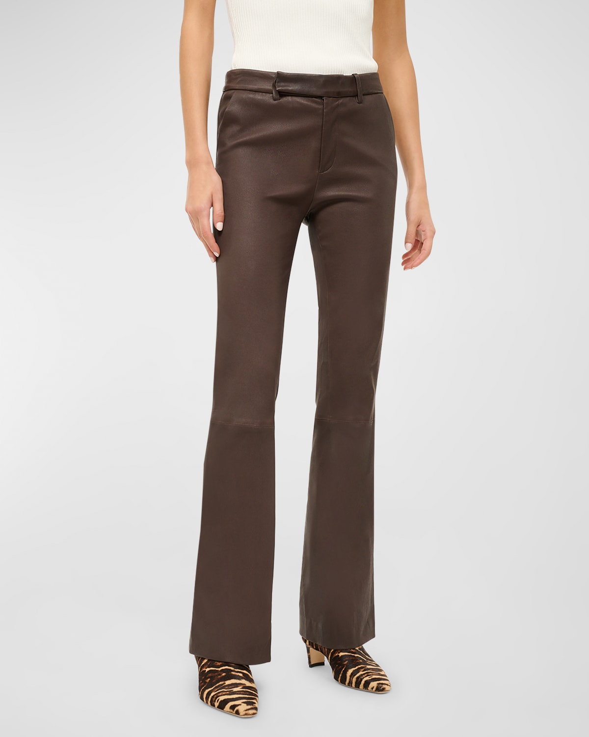 STAUD "Hanover" leather pants with a tabbed waistband Mid rise Side slip pockets; back welt pocket Full length Bootcut legs Zip fly; hookandbar closure Leather Dry clean Imported