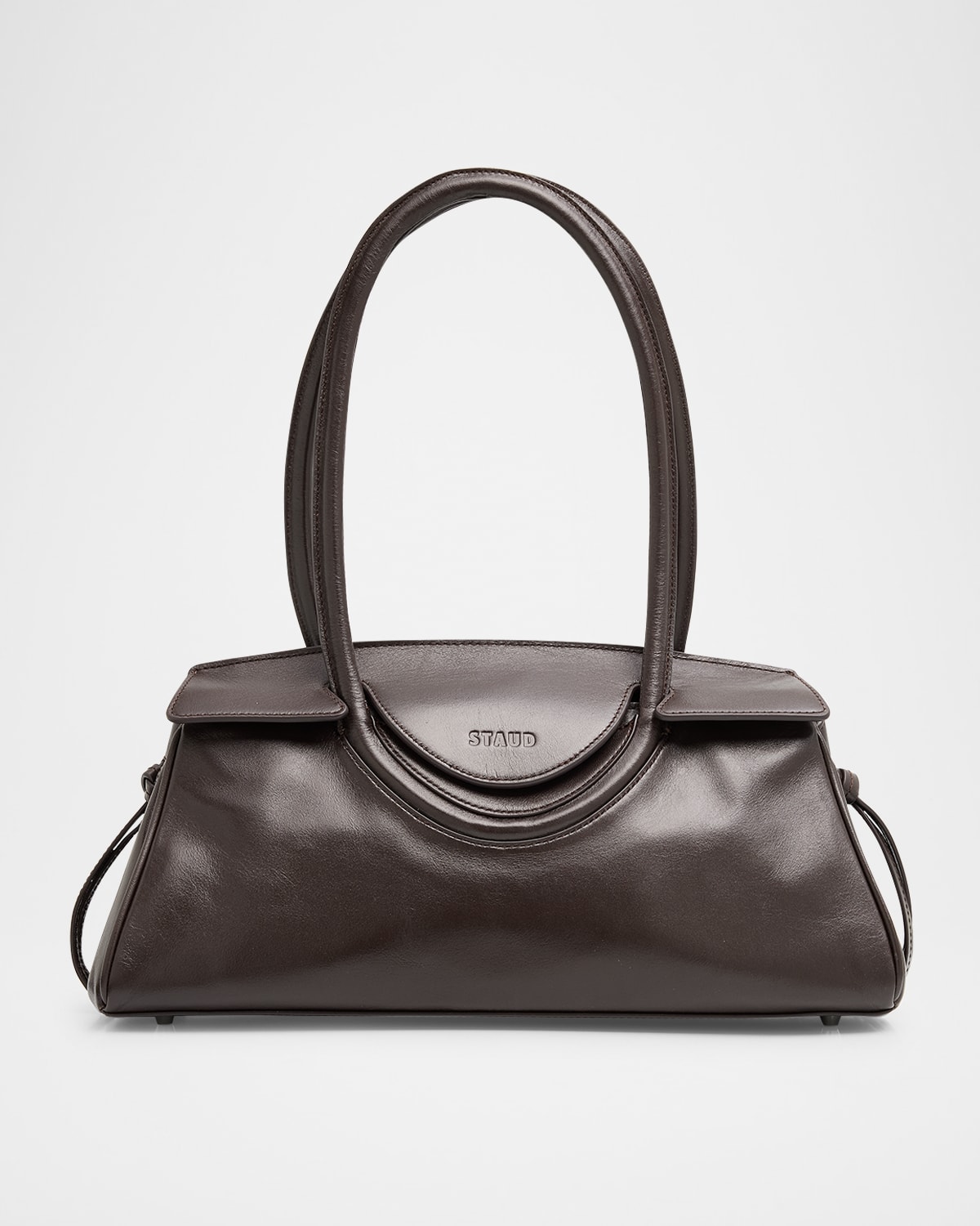 Designed in a chic eastwest shape, this STAUD "Maude" shoulder bag is cut from polished leather with a softly rounded silhouette and selfpiped edges Rolled shoulder straps, 8.8" drop Flap top Gusseted sides with knotted tassels Exterior, slip pocket under flap Feet protect the bottom of the bag Approx. 6.5"H x 15"W x 3.5"D Spot clean Imported