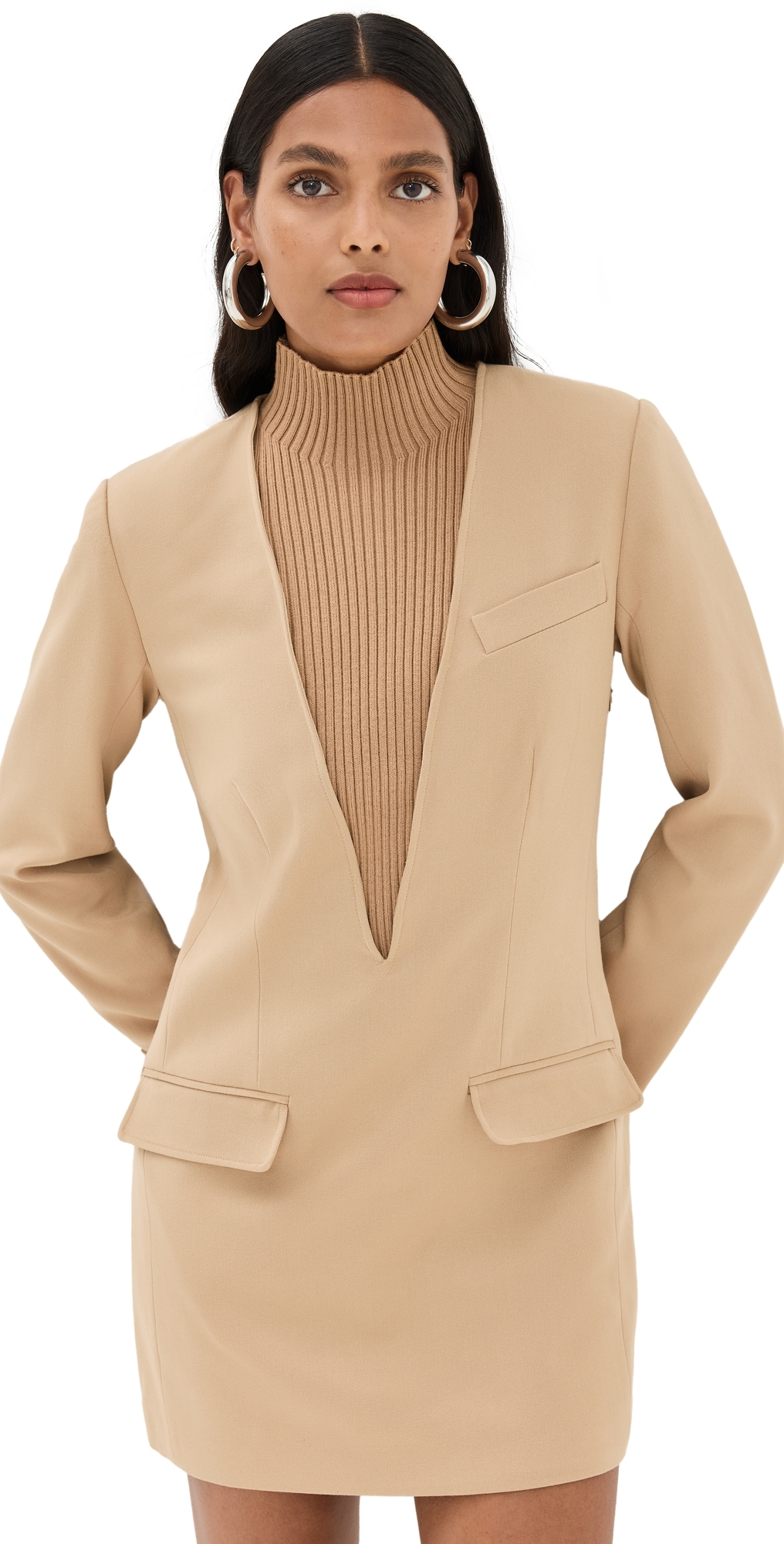 Fabric: Mid-weight, super-stretch suiting. Padded shoulders. Knit panel at front. Turtleneck. Long sleeves. Hidden zip at side. Front flap pockets and welt breast pocket. Shell: 63% polyester/33% rayon/4% elastane. Trim: 100% wool. Lining: 100% polyester. Dry clean. Imported, China. Measurements: Measurements from size S Length: 31in / 79.0cm, from shoulder