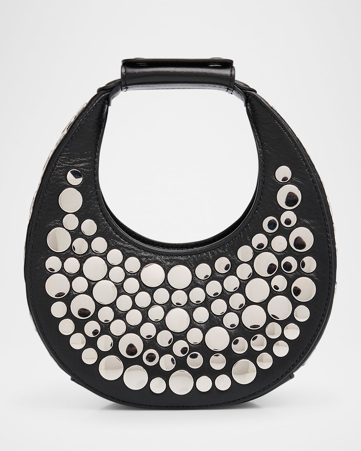Designed in leather, this STAUD curved tophandle bag sports an oval silhouette decorated with mirrored metallic studs Top handle, 4" drop Detachable leather shoulder strap, 18" drop Can be worn as a top handle or shoulder bag Open top with magnetic closure Approx. 8.5"H x 7.5"W x 3.8"D Spot clean Imported
