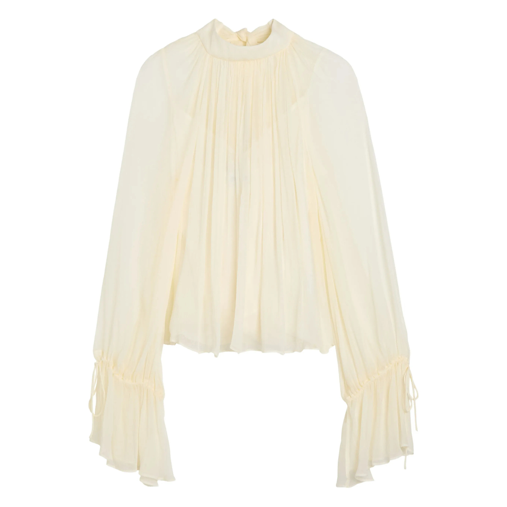 ivory pleated design high neck drawstring cuffs flared sleeves tie detail