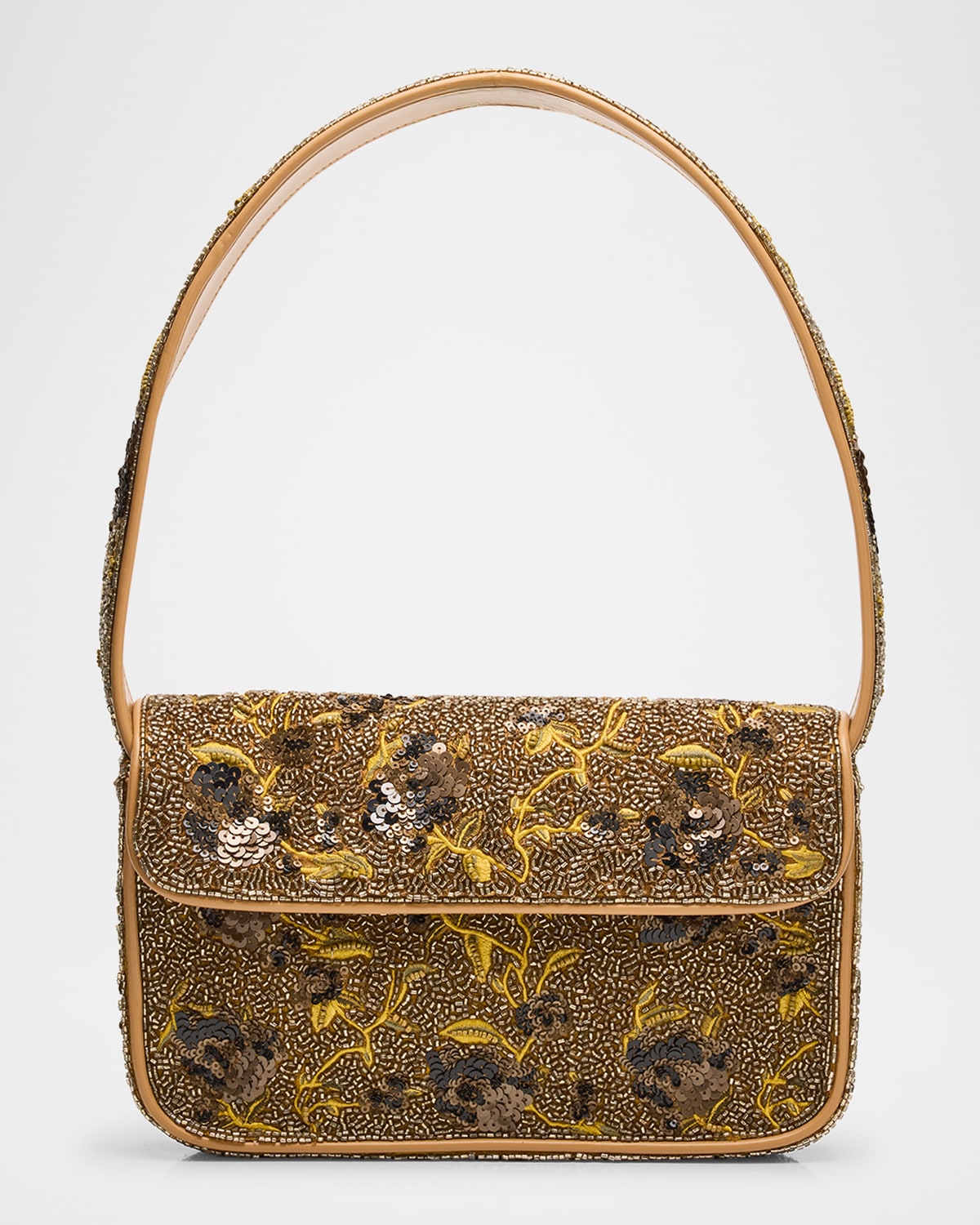 Made of rayon, this STAUD "Tommy" shoulder bag is fully beaded and features vegan leather trim for a smooth contrast of texture Flat shoulder strap, 8" drop Flap top with magnetic closures Exterior, back slip pocket Interior, one zip pocket Approx. 5.9"H x 10"W x 1.9"D Glass/ProViscose® rayon Spot clean Imported