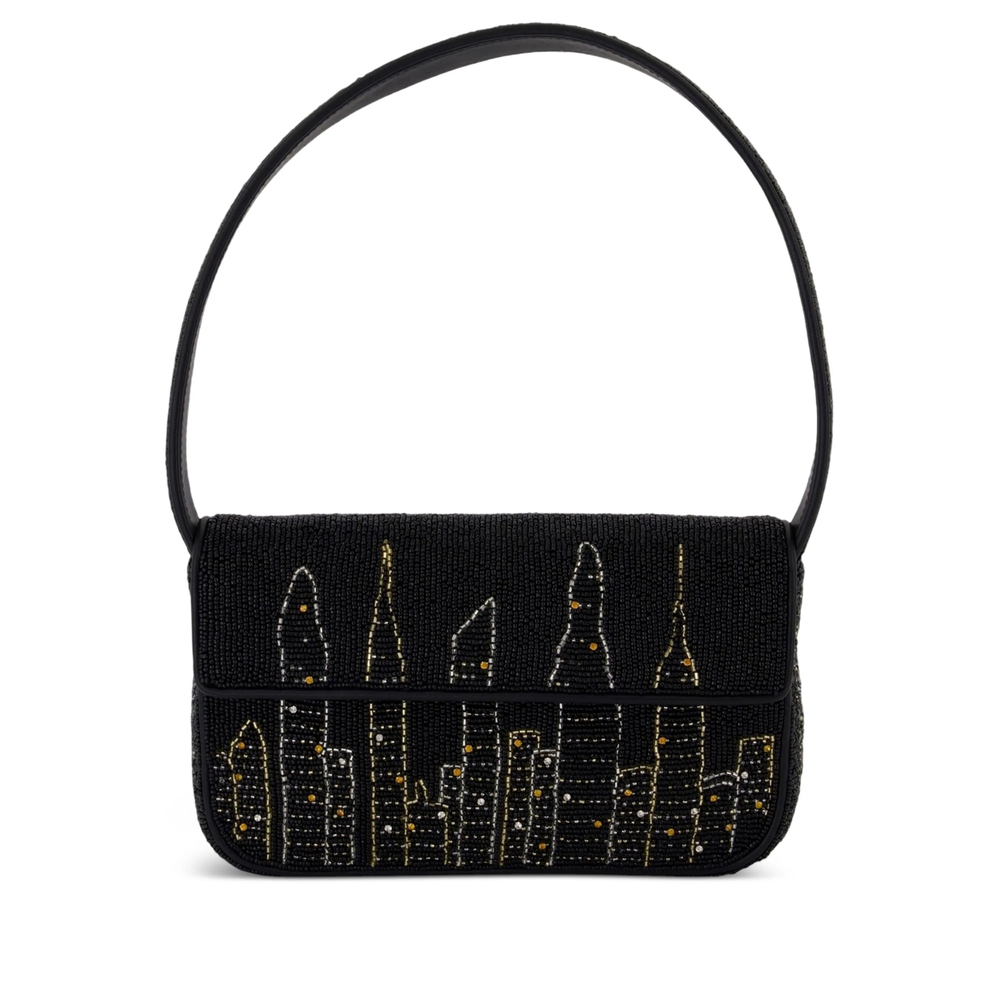 black glass bead embellishment skyline motif top handle flap closure rectangular shape
