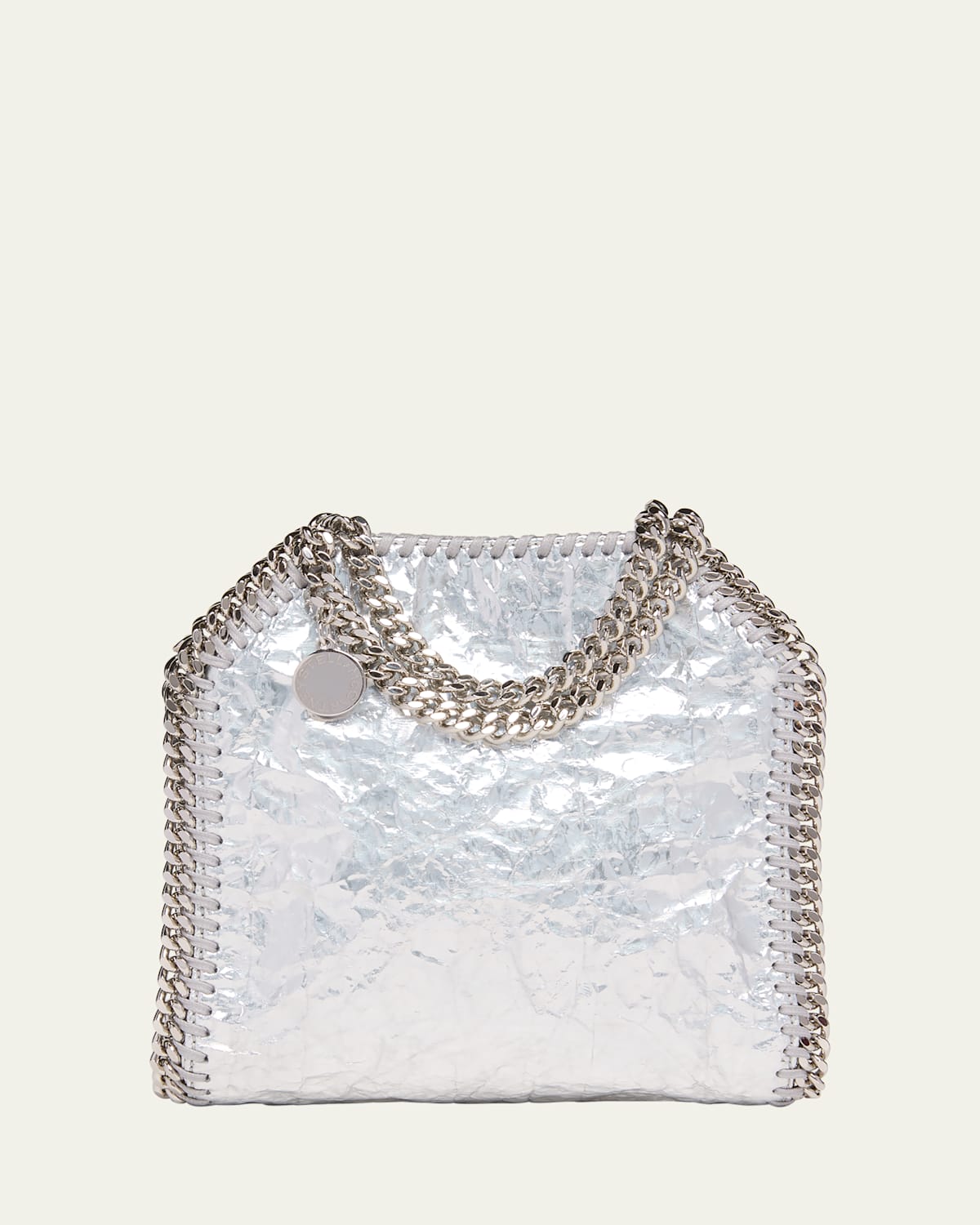 Stella McCartney "Falabella" tote bag is consciously crafted from their buttery soft, vegan alternative to animal leather with a cracked, metallic silver finish. Signature recycled brass and recyclable aluminium diamondcut chain Dual chain top handles with medallion logo charm Chain shoulder strap Can be worn as a top handle or shoulder bag Open top with magnetic closure Interior, one slip pocket Waxed GOTScertified organic cotton lacing Lining: Recycled polyester monogram lining Approx. 6.9"H x 7.1"W x 2.3"D Nylon/aluminum/polyurethane Made in Italy