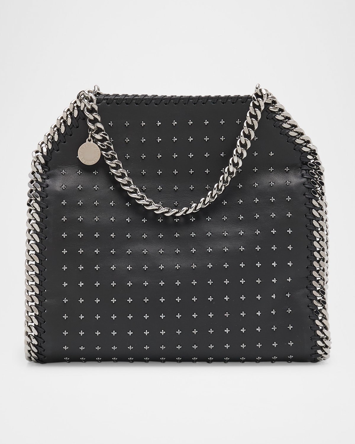 This Stella McCartney "Falabella" vegan leather (polyester) tote bag is studded with metallic crosses and trimmed with diamondcut chain and whipstitching Chain top handles Stowable chain shoulder strap Can be worn as a top handle or shoulder bag Open top with magnetic closure Interior, one slip pocket Logoprint recycled polyester lining Approx. 10.4"H x 9.3"W x 3.9"D Spot clean Made in Italy