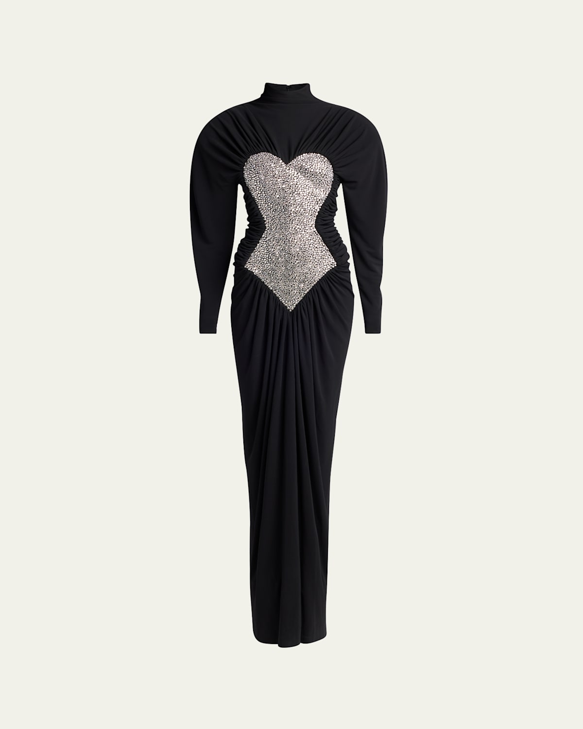 Detailed with oversized shoulders and flattering ruching throughout, this jersey gown by Stella McCartney showcases a crystalembellished body contouring center detail Mock neckline Long sleeves Full length Bodyskimming fit Invisible back zipper Nylon/polyamide/elastane/glass Dry clean Made in Italy