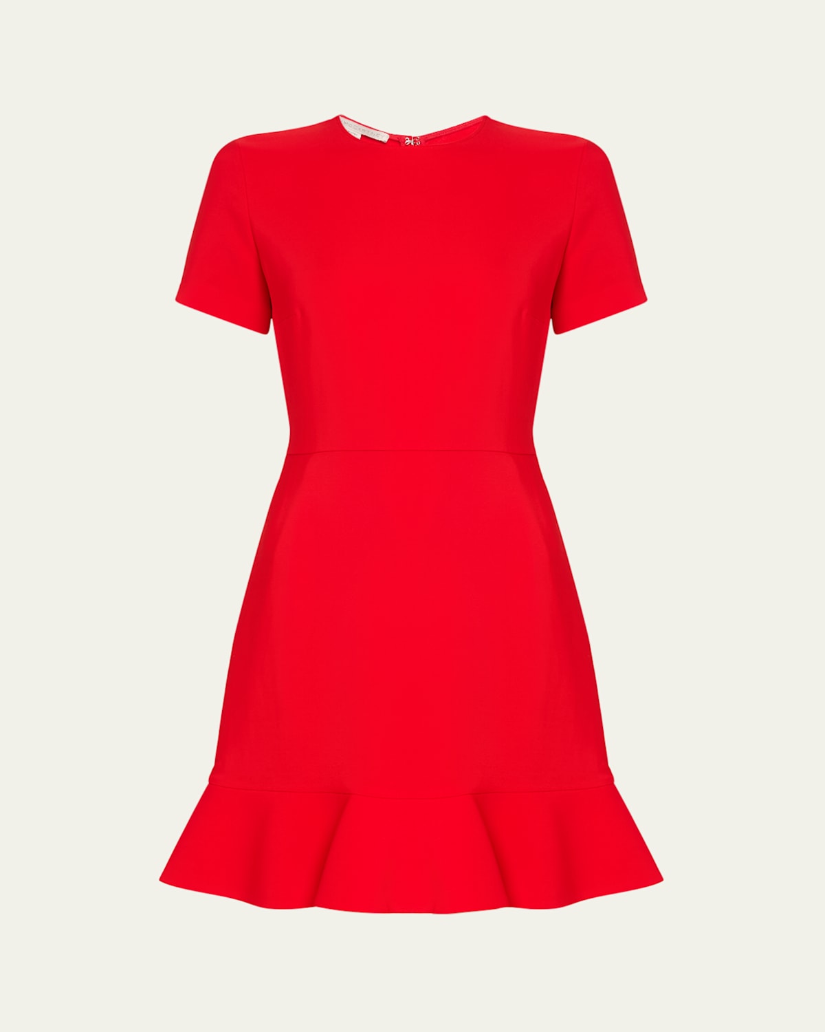 Stella McCartney iconic mini dress features a flared flounce hem Round neckline Short sleeves Hem falls above the knee Aline silhouette Back zip closure Viscose/elastane Made in Italy