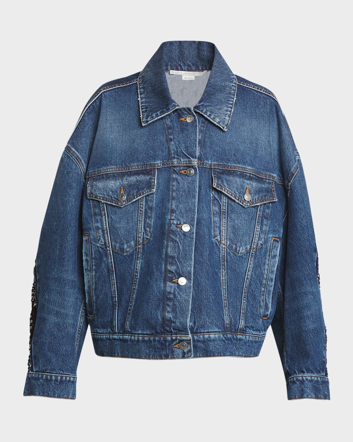 Stella McCartney blue vintage denim jacket featuring lace detail along the back and sleeves Point collar; button front Long sleeves; button cuffs Chest buttonflap pockets Side welt pockets Oversized fit Cotton Made in Italy