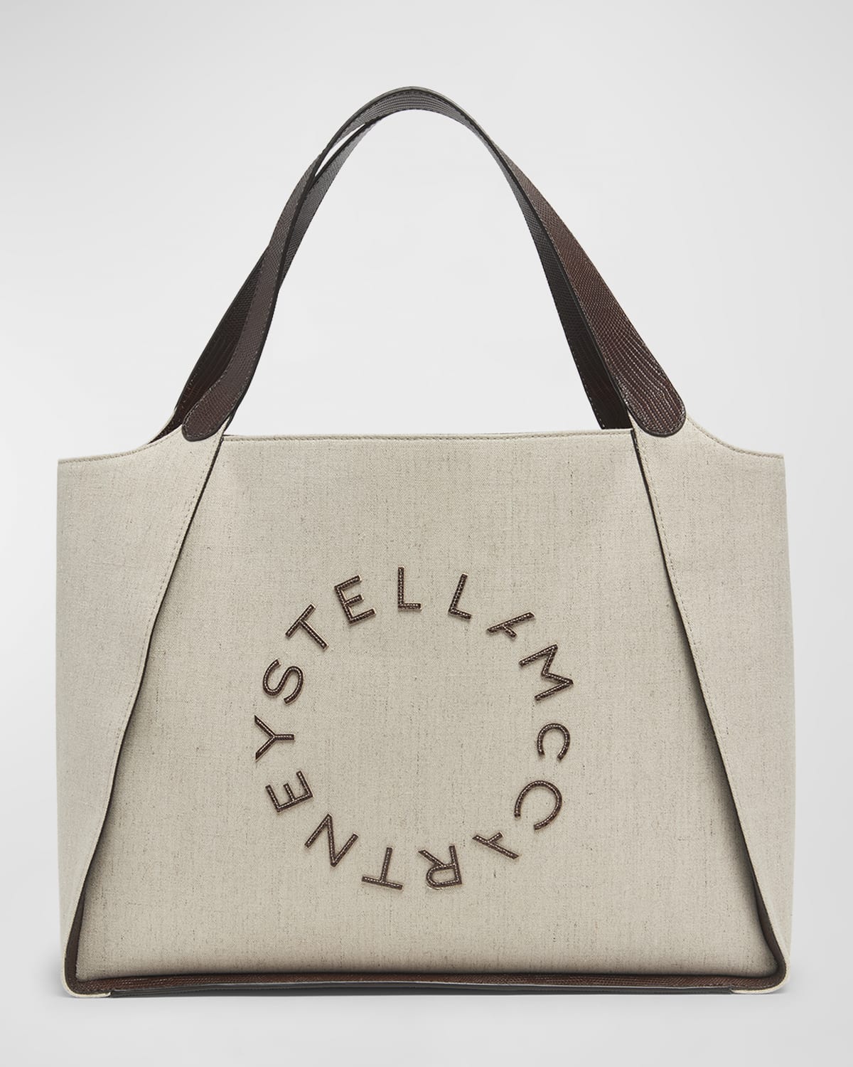 Stella McCartney eco canvas and embossed hemp, lyocell, GRS recycled cotton, recycled polyester, and UPPEAL™ apple waste tote bag with logo UPPEAL™ is a vegan, crueltyfree alternative to animal leather made from the waste of apples grown for juice and jam in Northern Italy and innovated by Mable Industries and Frumat since 2014. By using the waste of apples grown for the juice and jam industries, UPPEAL™ taps into industrial symbiosis - repurposing local food waste as a resource. The waste - including leftover pulp, skins, and seeds that are otherwise sent to landfill or burned - is recovered by Bolzanobased Frumat and dehydrated and ground into Frumat Apple Powder. The powder is then used by Mabel Industries to substitute oil and other fossil fuel derivatives, combined with polyurethane for durability and coated onto a canvas to create UPPEAL™. Shoulder straps Open top Interior, leashed flap pouch bag Lining: Polyurethane/GRS recycled nylon Approx. 12.4"H x 15.7"W x 5.6"D Spot clean Made in Italy