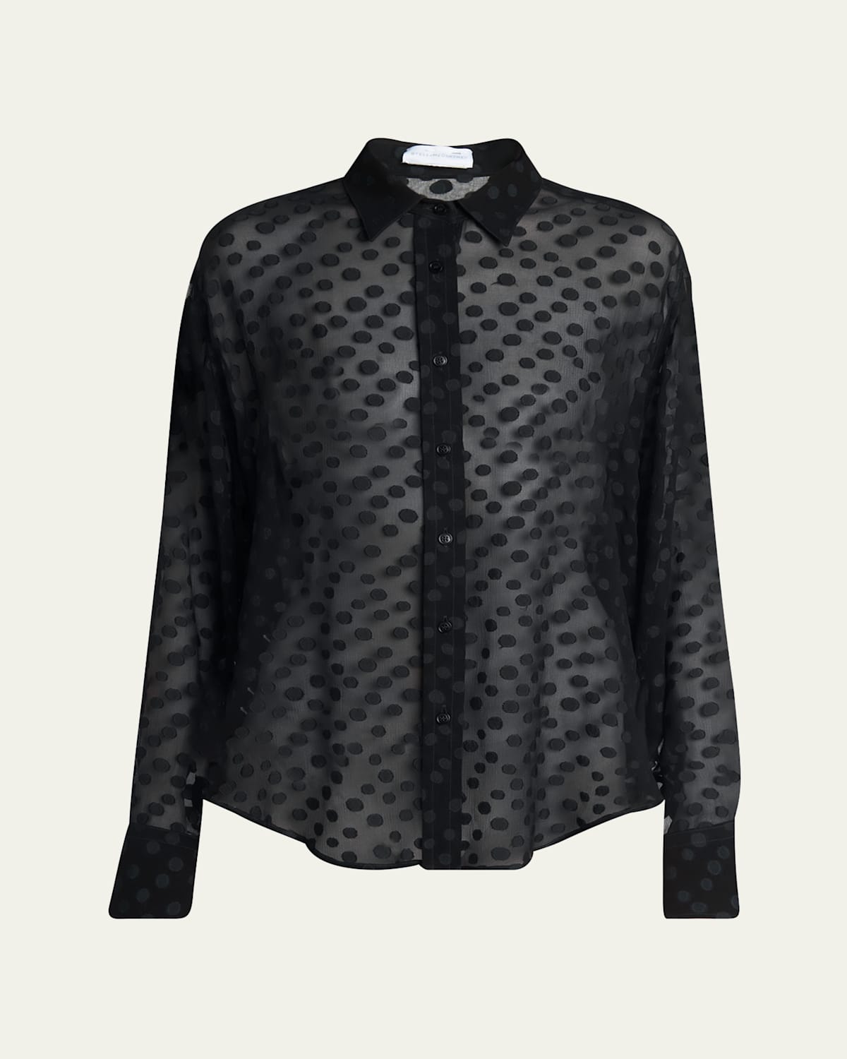 Stella McCartney sheer blouse with an allover polka dot pattern Spread collar; button front Long sleeves; button cuffs Relaxed fit Silk/polyester Dry clean Made in Romania