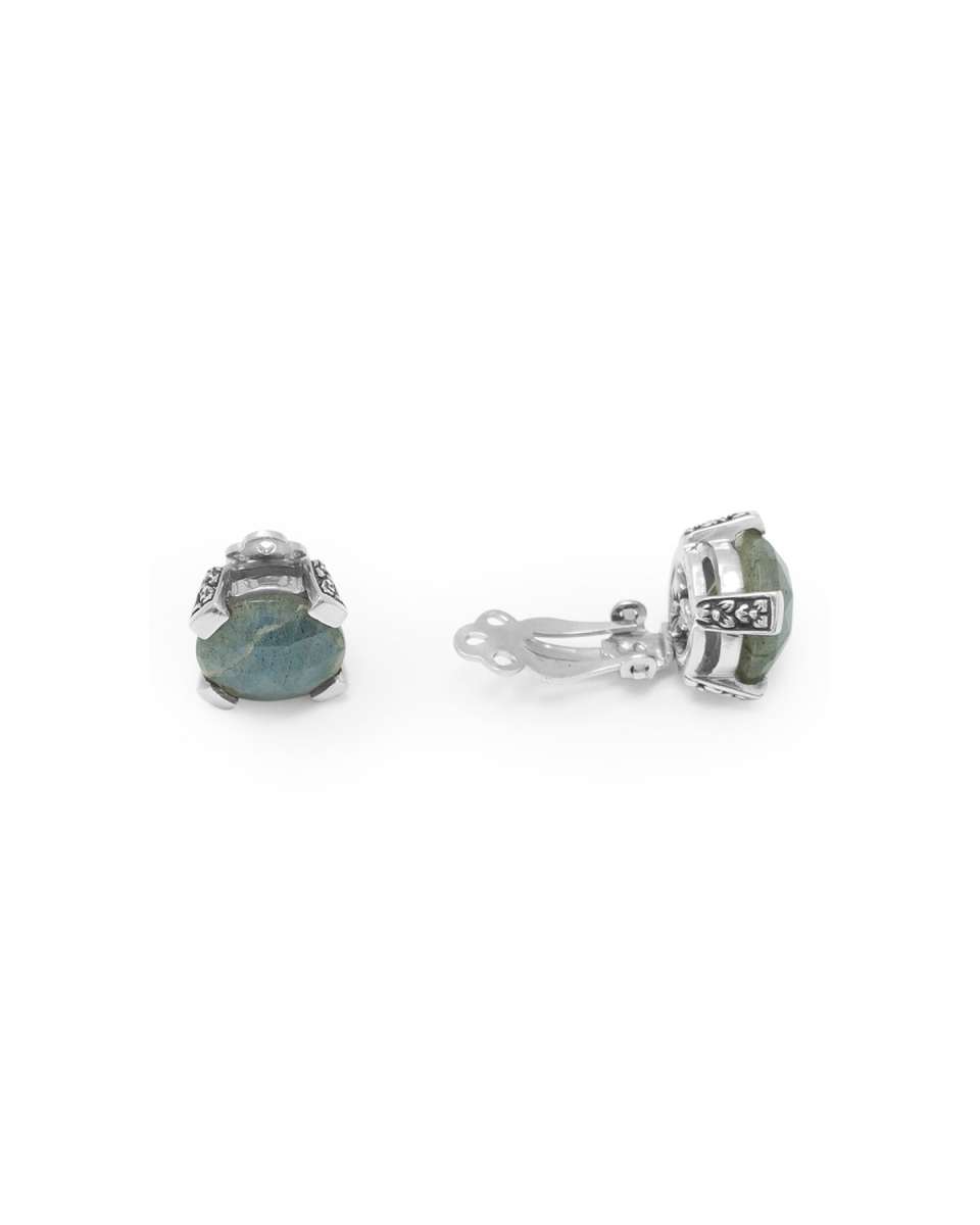 Faceted labradorite clipon earrings by Stephen Dweck. A glimmering addition of color to surround your face. Chiseled flower sterling silver prongs. Faceted natural labradorite gemstone. Clipon backs. Imported.
