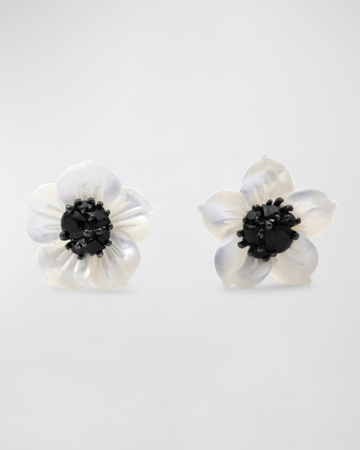 Stephen Dweck earrings from the Colorbloom Collection Approx. 0.68"L x 0.6"W Sterling silver Handcarved white motherofpearl with black spinel Combined total carat weight: 9.20 For pierced ears Imported