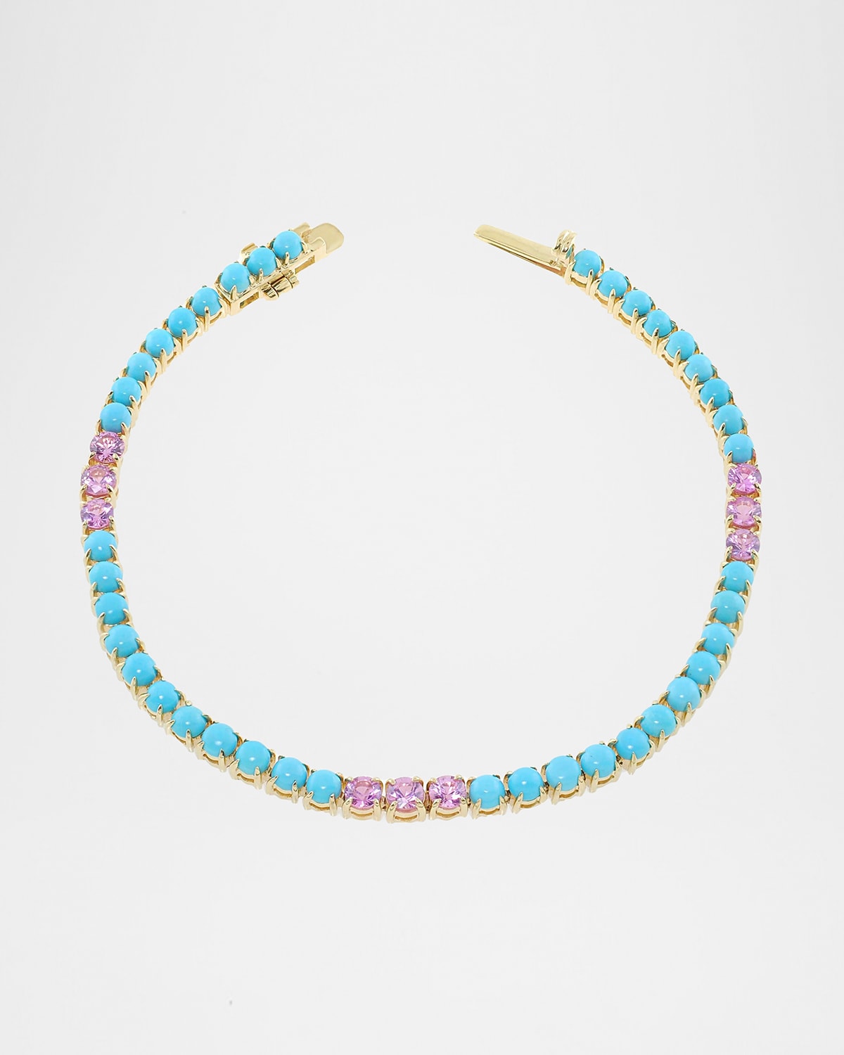 Stevie Wren rainbow tennis bracelet from the GemBar Collection Polished 14karat yellow gold chain and hardware Sapphires and turquoise Safetylatch closure Approx. 6.75"L Full cut; total carat weight: 5.59ct, 10.25 Gr Easily clean with soap and water Made in USA