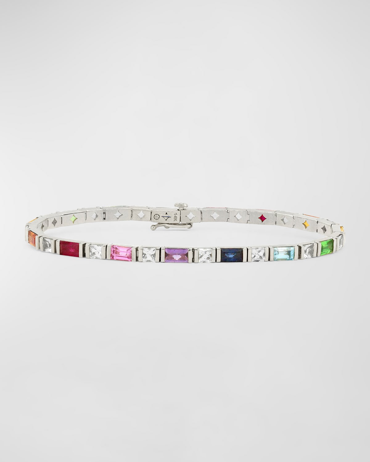 Stevie Wren tennis bracelet Approx. 6.75"L 14karat white gold Baguette and princesscut pink, purple, blue, yellow, orange sapphire, ruby, blue zircon, and tsavorite Total combined carat weight: 8.71 Box clasp closure Made in USA from imported materials