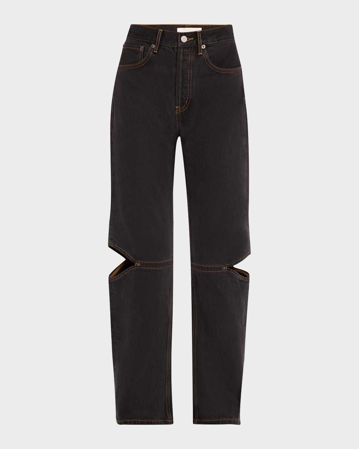 Still Here "Cowgirl" jeans featuring diamond cutouts at the knees in black denim High rise Fivepocket style Curved legs Full length Buttonfly; belt loops Cotton Imported