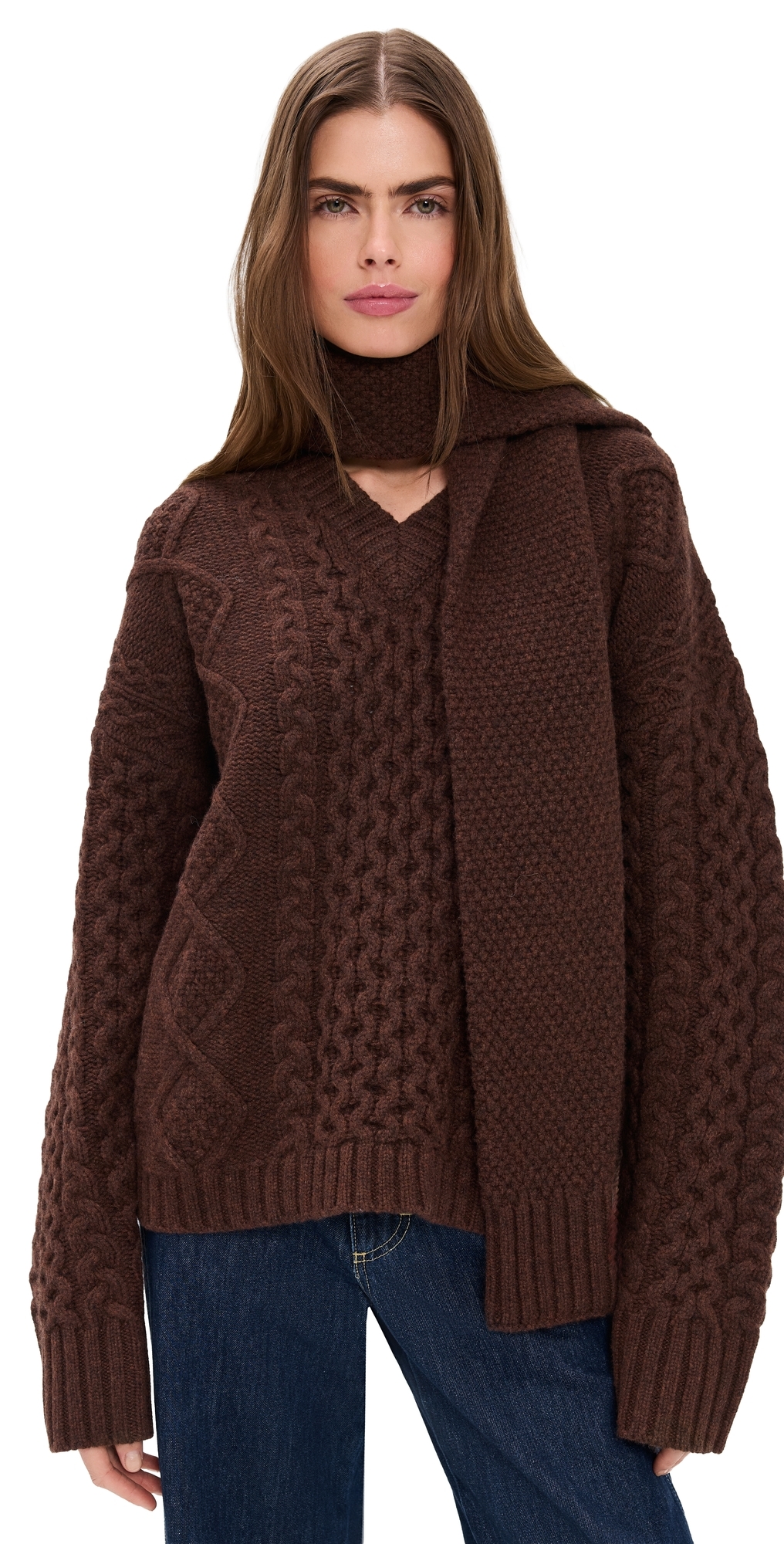 Fabric: Heavyweight cable knit with stretch. Tube scarf with detachable button closures at back. Ribbed trim. V neck. Long sleeves with dropped shoulders. Shell: 100% wool. Dry clean. Imported, China. Measurements: Measurements from size XS/S Length: 25.5in / 65.0cm, from shoulder