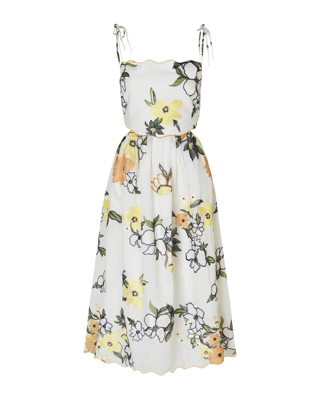 The Scalloped Cut Out Dress in Flowers Embroidery by Stine Goya is a white midi dress featuring floral embroidery, scalloped edges, and cut-out details at the waist. 39% TENCEL™ / 34% ECOVERO™ Viskose / 20% Polyamide / 7% Linen Model is 178 cm tall and wears size XS. Adjustable tie straps Concealed back zipper.