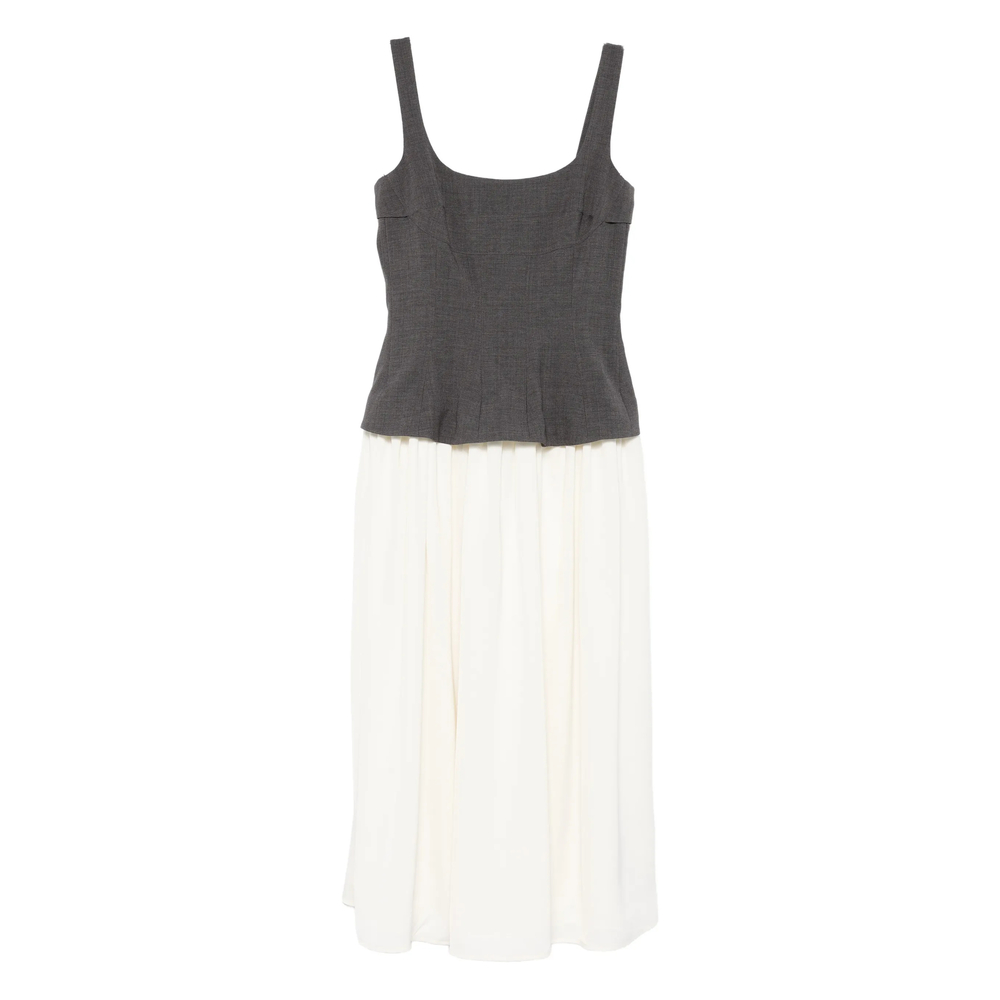 grey and cream square neck sleeveless pleated skirt gathered detail