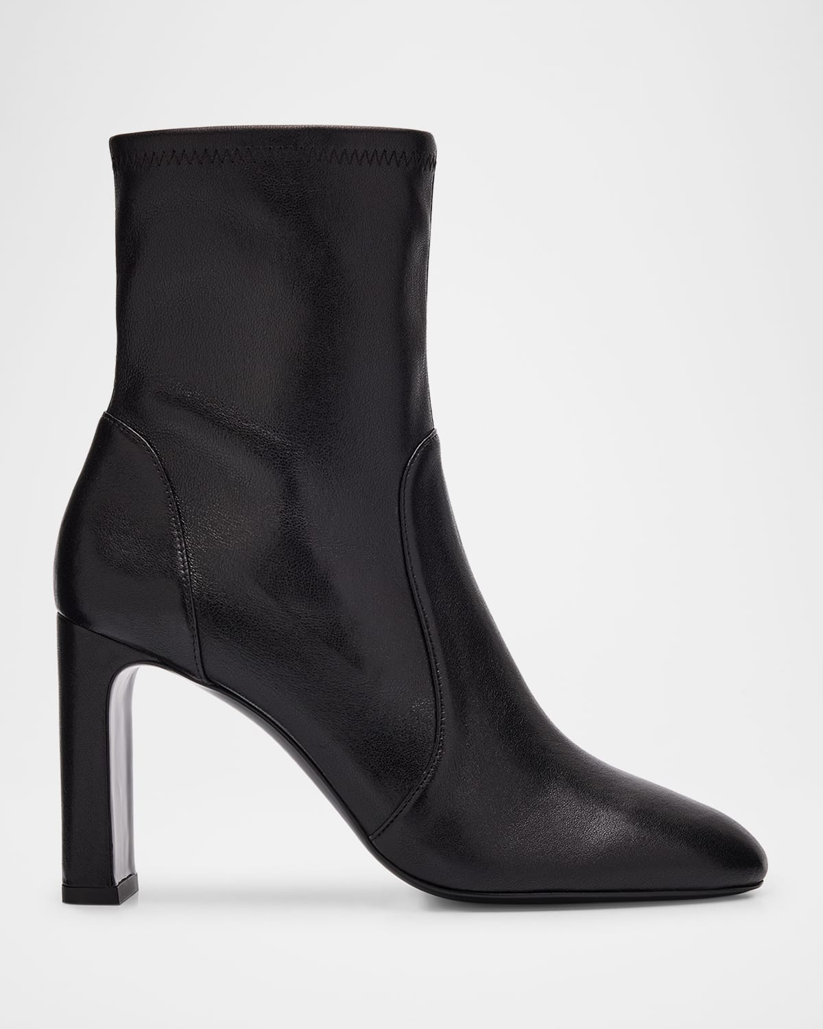 Stuart Weitzman "Babette" booties in smooth calf leather 3.25 in / 85 mm covered block heel Almond toe Pullon style Leather outsole Lining: Leather Professional cleaning recommended Made in Spain