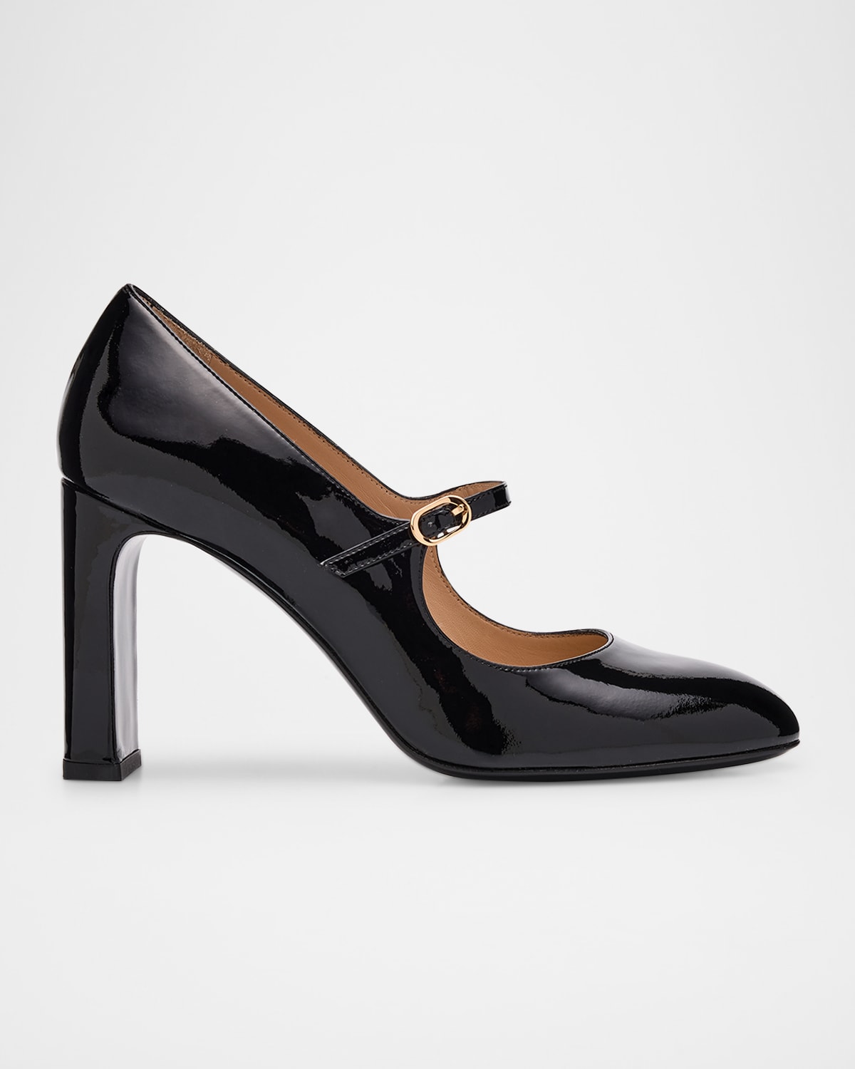 Stuart Weitzman "Babette" pumps in patent leather 3.25 in / 85 mm covered block heel Round toe Mary Jane buckle strap Leather lining and outsole Professional cleaning recommended Made in Spain