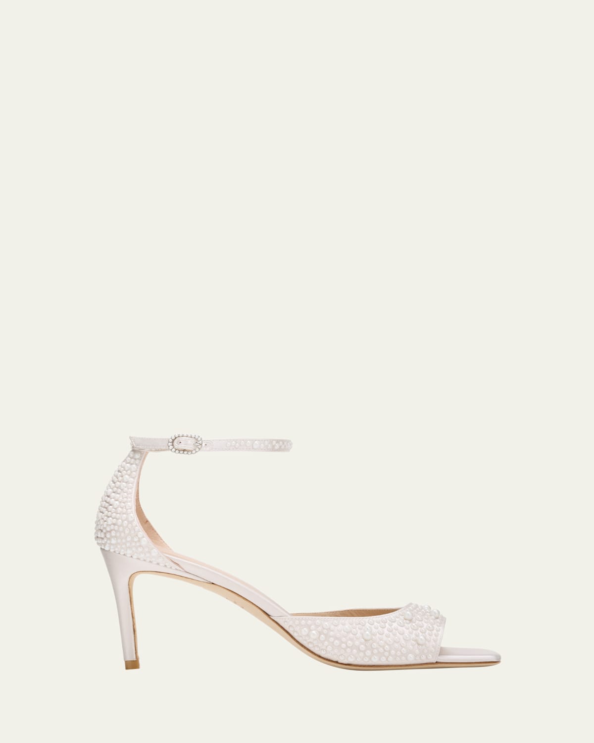 Stuart Weitzman "Bliss" pearlystudded silk cocktail sandals 3.00 in / 75 mm stiletto heel Open toe Adjustable ankle strap Leather outsole Lining: Leather/satin Spot clean Made in Italy