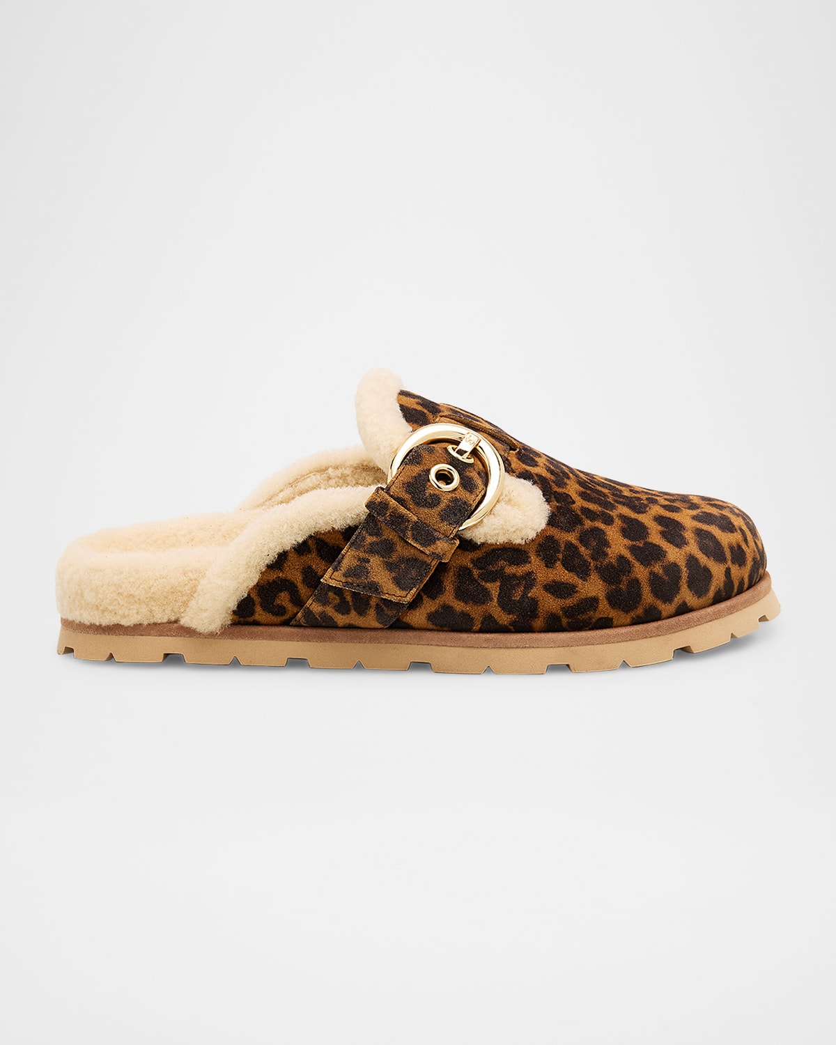 Lined with plush, natural and dyed sheep shearling (Spain) for added warmth and comfort, the "Chrystie" mules by Stuart Weitzman are crafted with a leopardprinted suede upper Flat heel Round toe Notched vamp with oversized buckle strap Easy slide style Lightweight, flexible EVA outsole Hand wash Made in Spain