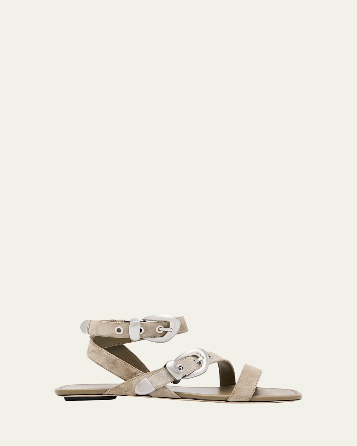 Stuart Weitzman "Maven" suede sandals 0.25 in / 10 mm flat heel Open toe Two band upper with buckle accent Adjustable ankle strap Leather outsole Lining: Leather Professional cleaning recommended Made in Spain