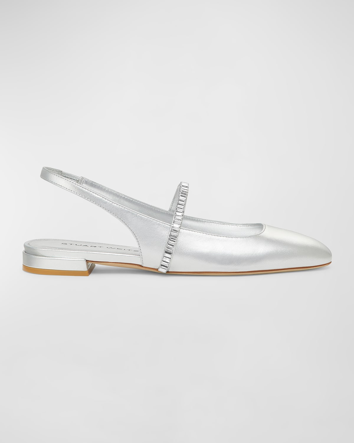Stuart Weitzman "Stefanie" metallic leather ballerina flats with crystal trim 0.25 in / 10 mm flat heel Round toe Embellished midvamp band Stretch slingback strap Leather outsole Lining: Leather Spot clean Made in Spain
