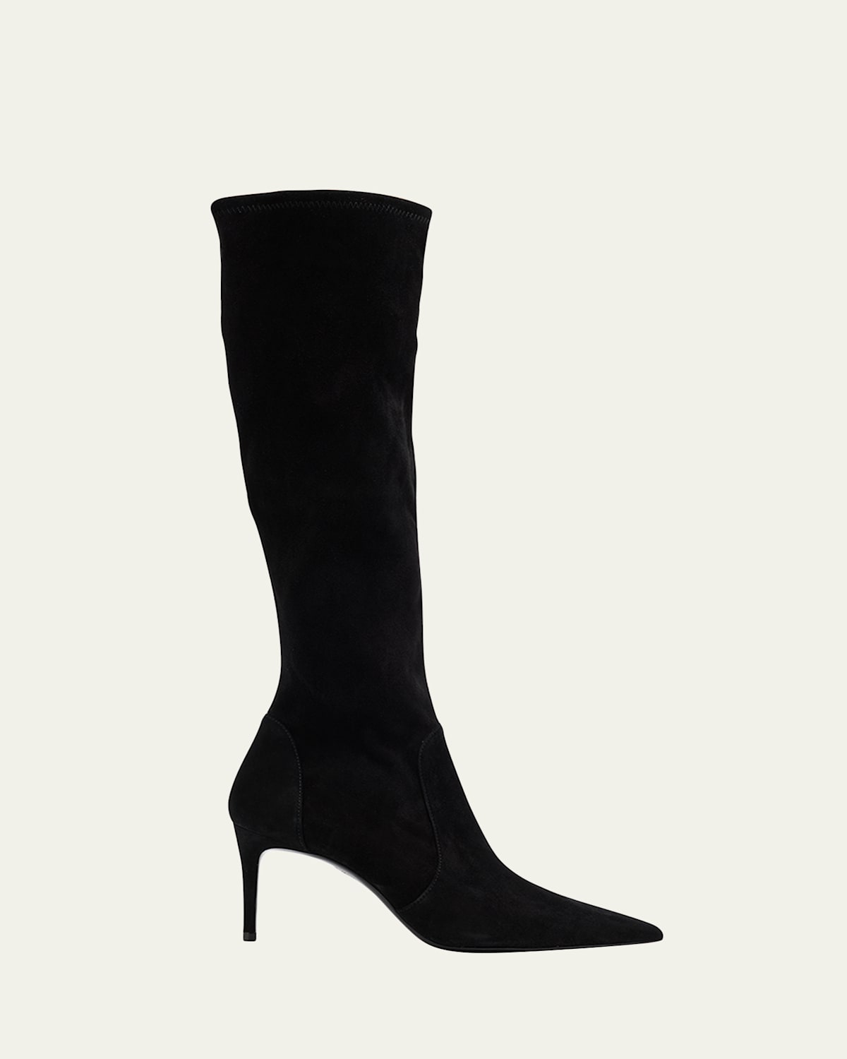 Stuart Weitzman "Stuart Power" stretch suede knee boots 3.00 in / 75 mm stiletto heel Pointed toe Pullon style Leather lining Leather outsole Professional cleaning recommended, spot clean Made in Spain
