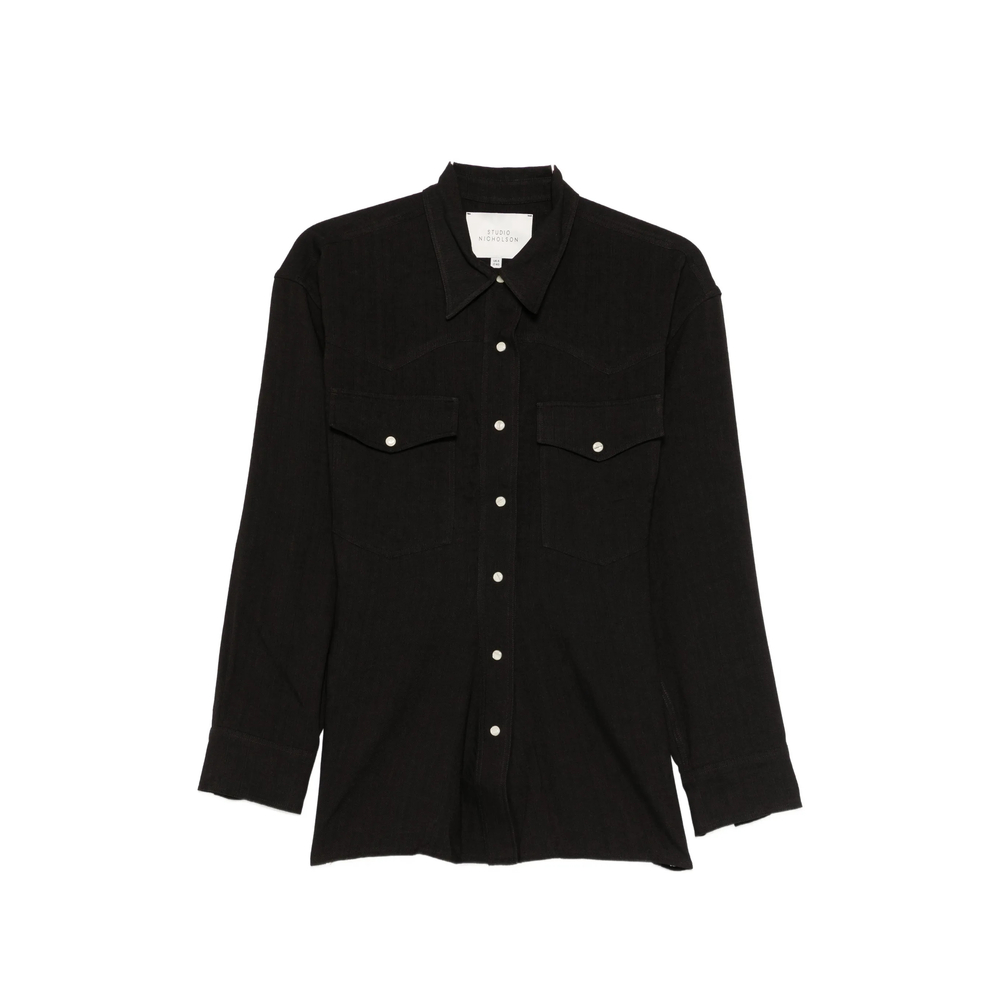 espresso black front button fastening chest patch pockets long sleeves pointed collar rear yoke