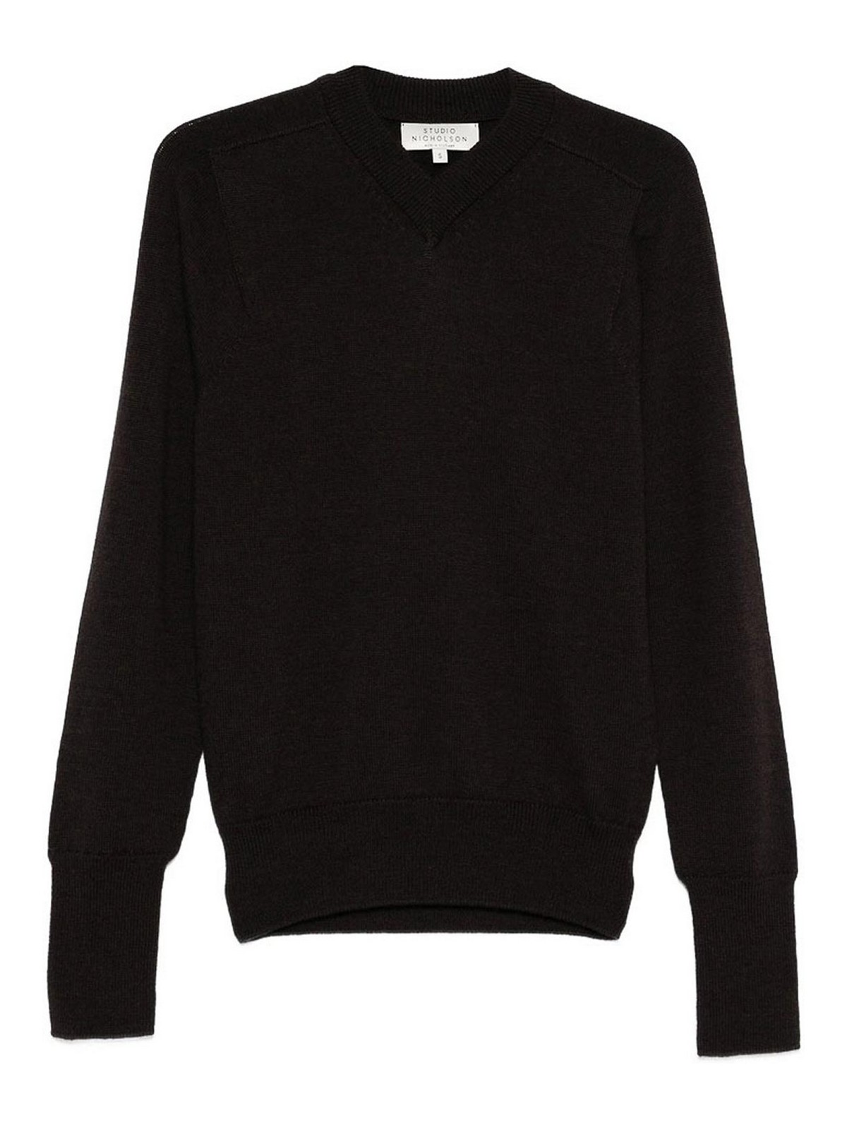 V noir, col, manches longues, poignets côtelés, ourlet côtelé