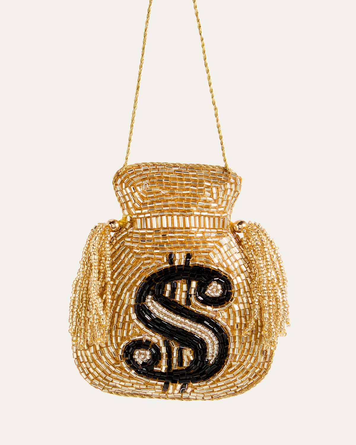 Beaded money bag ornament Made of glass beads and metallic thread Approx. 1"L x 3"W x 4"T Imported