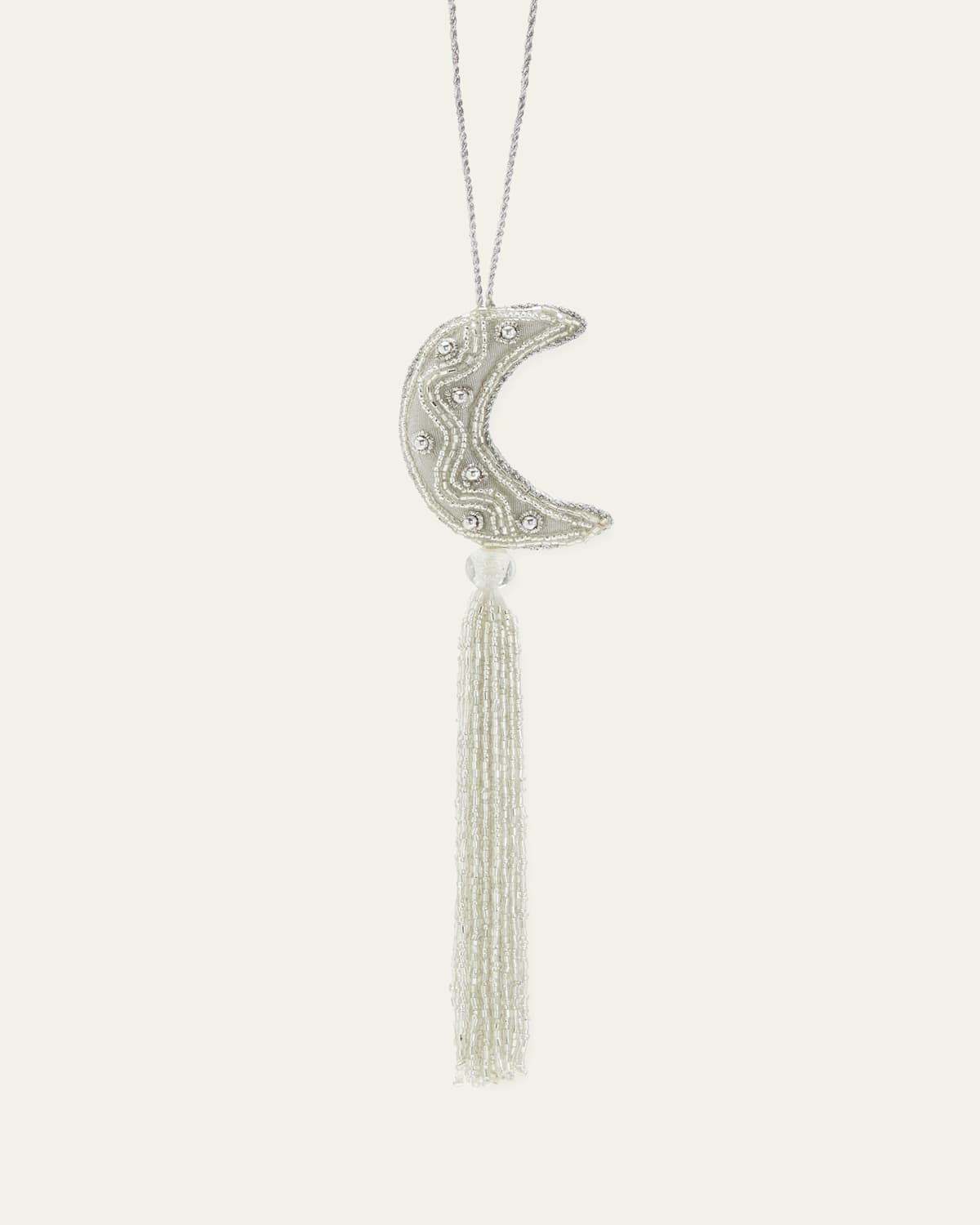 Moon ornament is handcrafted of glass beads and embroidered by master craftspersons in Agra, India. Features a beaded tassel Designed by Sudha in California Approx. 8"L x 2"W Sold individually Spot clean Imported